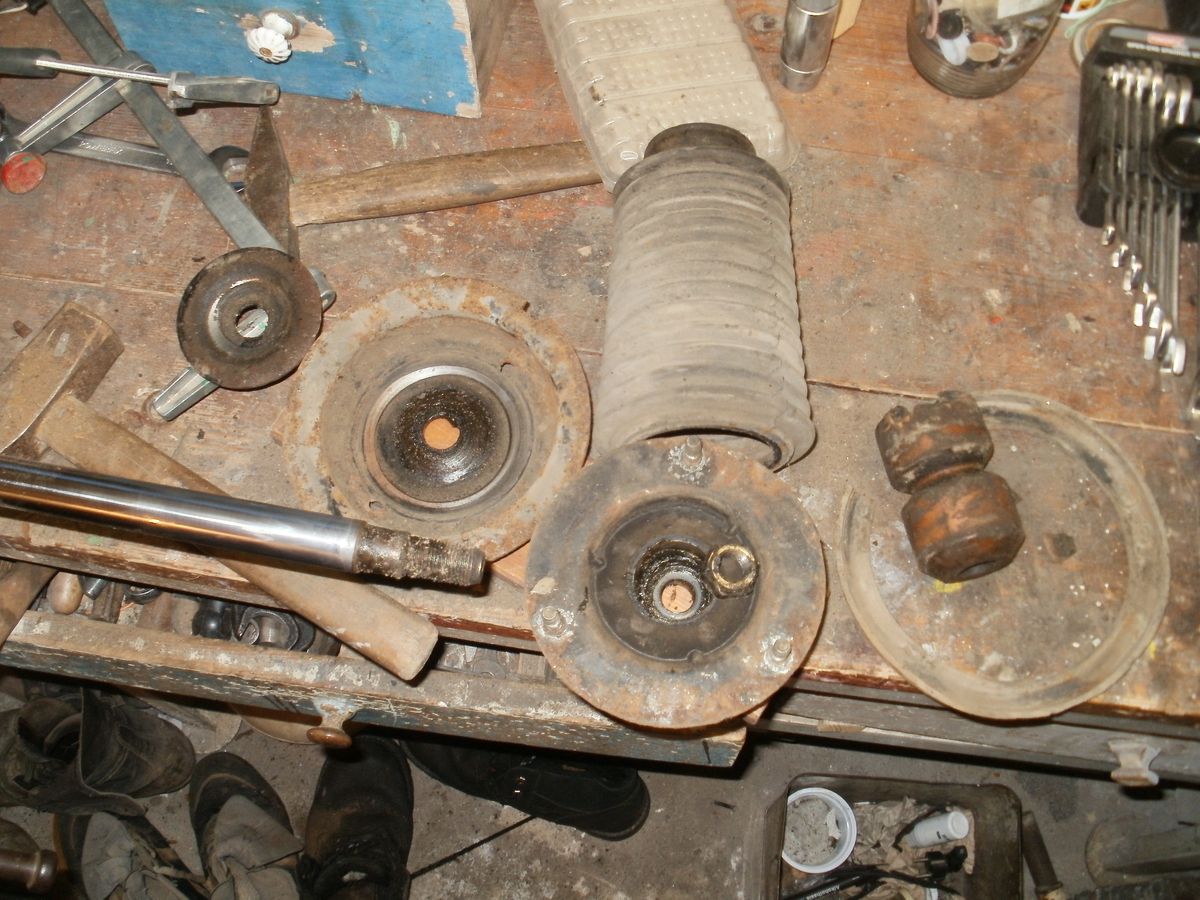 předevčírem jsem se pustil do rozebírání předního tlumiče s pérama... protože nemám v dílně stahovák pružin, tak jsem si jako kutil pomohl svěrkama... všechno bylo v poklidu do té doby, než jedna svěrka sklouzla a vyhodila létající talíř do prostoru dílny... naštěstí kytka s chapadlama zachytila ufo.