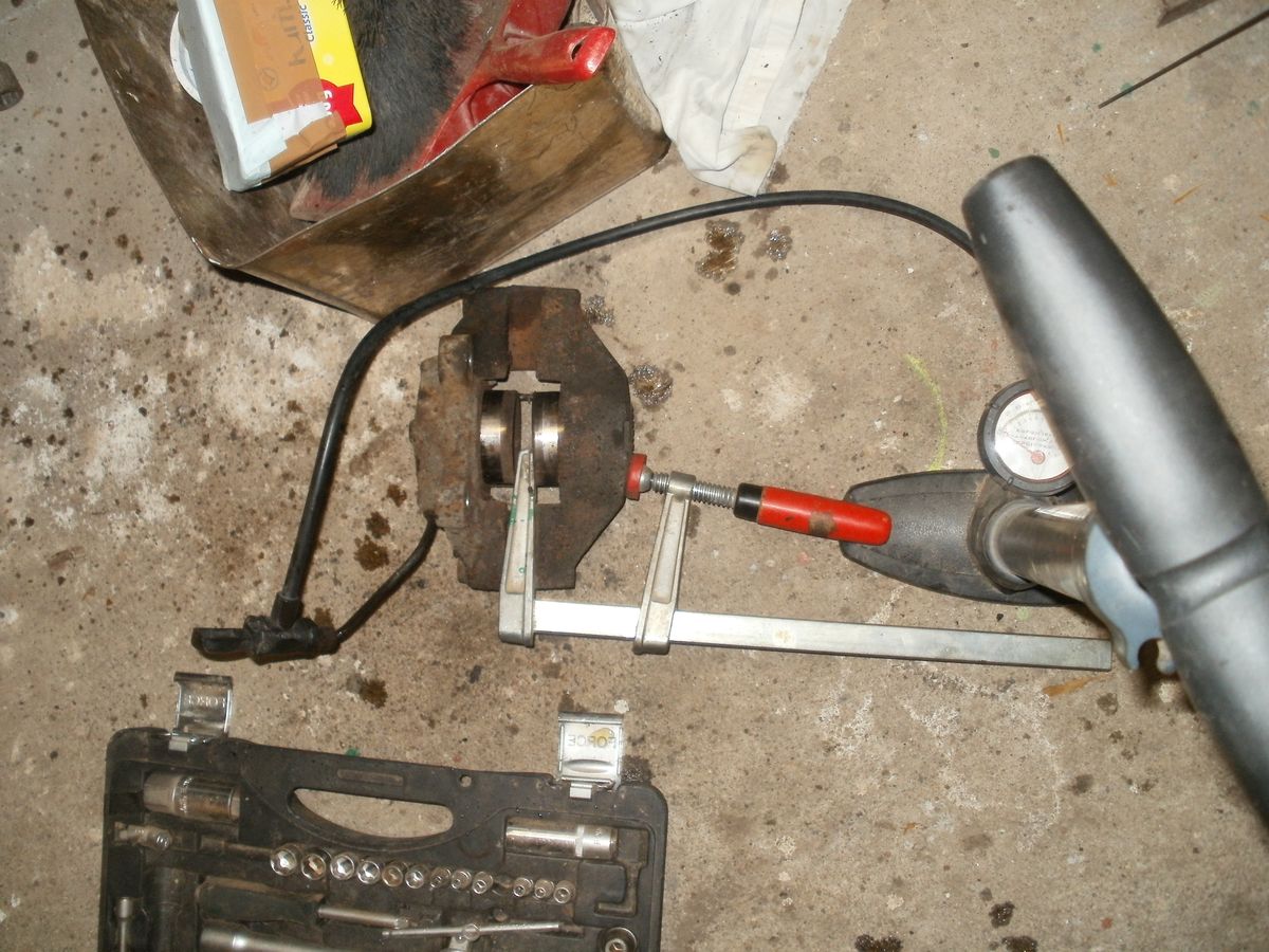 Už na začátku jsem uvažoval na pumpičkou, ale ta co jsem ji chytl jako první do ruky měla na konci závit a ten mi fakt nešel nasadit...(byla to na foukání vidlic u kola) Tak jsem se potrápil a pak jsem zavolal našemu dvornímu mechanikovi a ten mne teda utvrdil v tom pokusničení s pumpou (kompresorem). Vyhrabal jsem tedy mou velkou cyklopumpu (ještě že mám takovou výbavu) a nasadil na sešroubovaný třmen. A už to bylo, nejprve jedna strana, pak rozšroubovat třmen, ucpat propojovací díru a druha strana