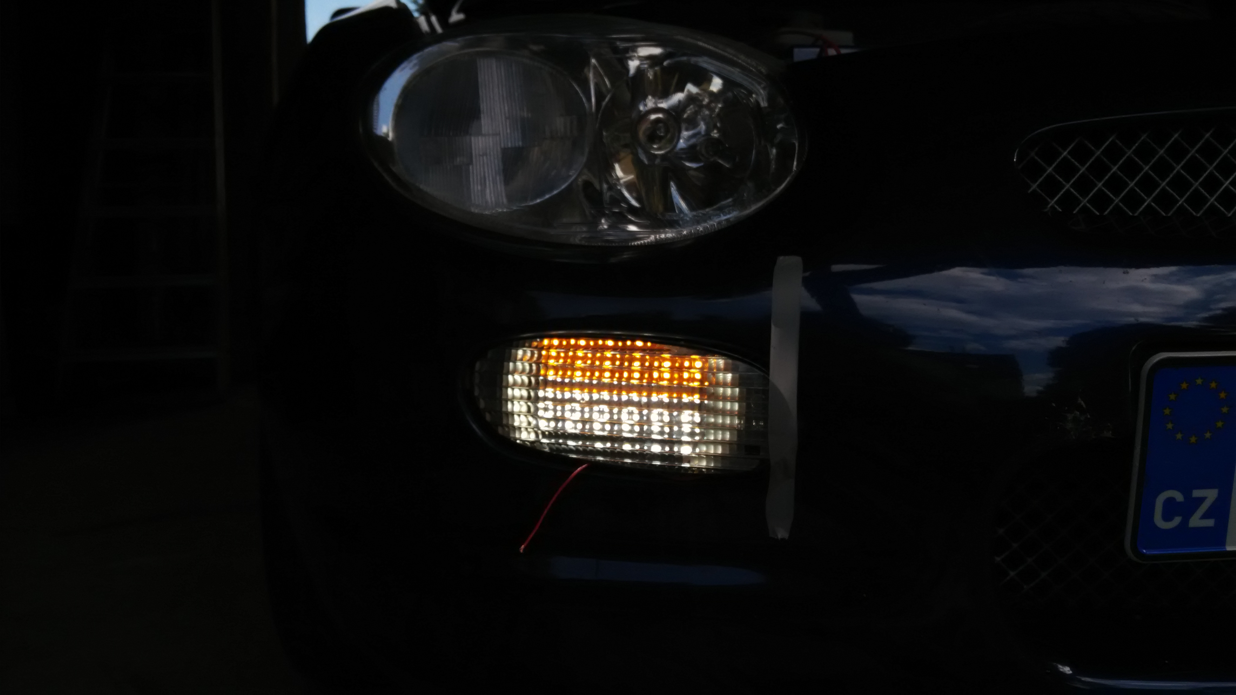 Dneska jsme si trošku hráli s blinkrem na eFku. Kromě zajímavého uchycení blinkru předchozím majitelem pomocí dřívka a gumy od trenýrek jsme zkusili i kombinaci blikače a bílých LED v jednom světle. Myslím, že druhá z testovaných variant vypadá slibně. Fotky jsou lehce zavádějící, to světlo se fotí špatně. Ale snad to brzo bude hotový a třeba to někdo i uvidí naživo