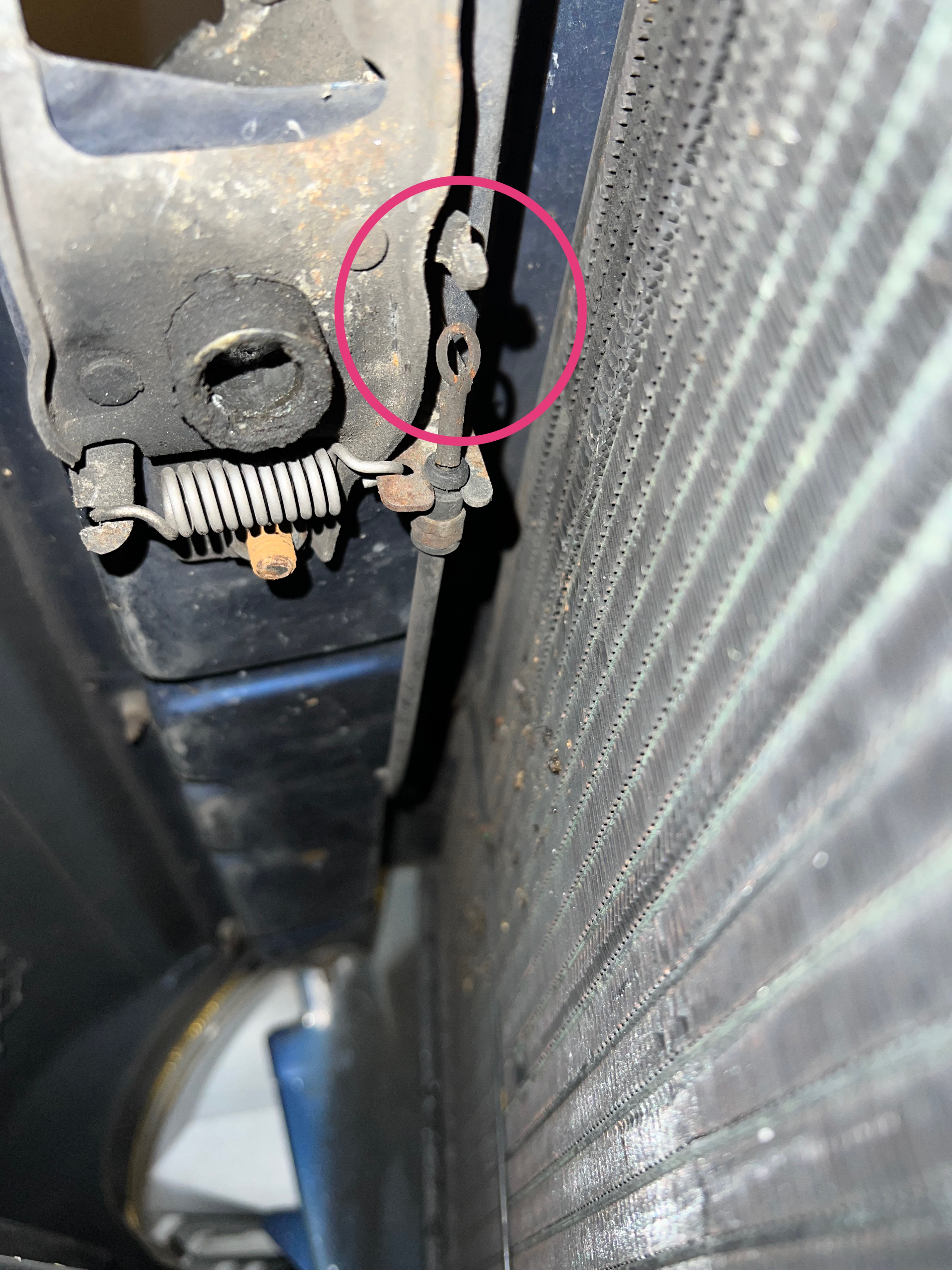 Vyřešeno, je potřeba si lehnout pod auto a narvat ruku se šroubovákem mezi nárazník a chladič. Tam je pak packa viz kolečko a tím odjistit zámek. Je i vidět závada, vypadlé lanko z packy co odjistí kapotu ☺️ tak kdyby to taky někdo řešil....