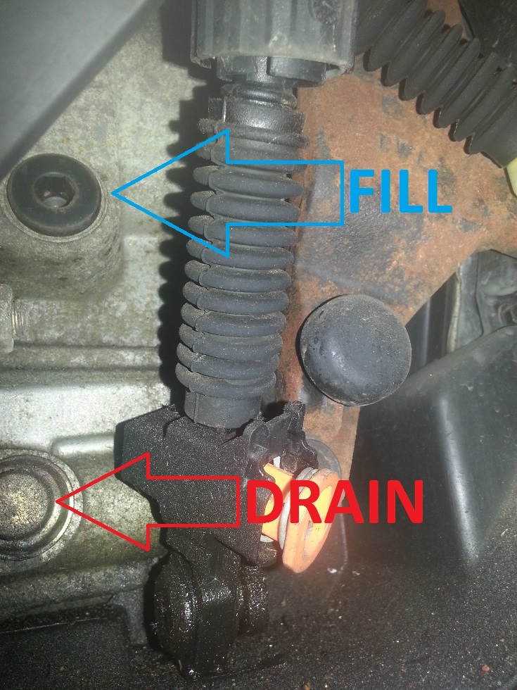 Ten šroub, který je pod kontrolním/napouštěcím šroubem není vypouštěcí šroub, i když o tom na internetu někteří píšou. Jednak není na dně převodovky, takže bys nevypustil všechno, ale jen zhruba půlku, navíc zjevně nějak souvisí s řadicími vidlicemi, takže bych ho nedoporučoval povolovat. Je na něm i kontramatka, takže je asi nějak nastavený. V místě, kde by měl být vypouštěcí šroub (na fotce vlevo pod poloosou), je jen ucpávka.