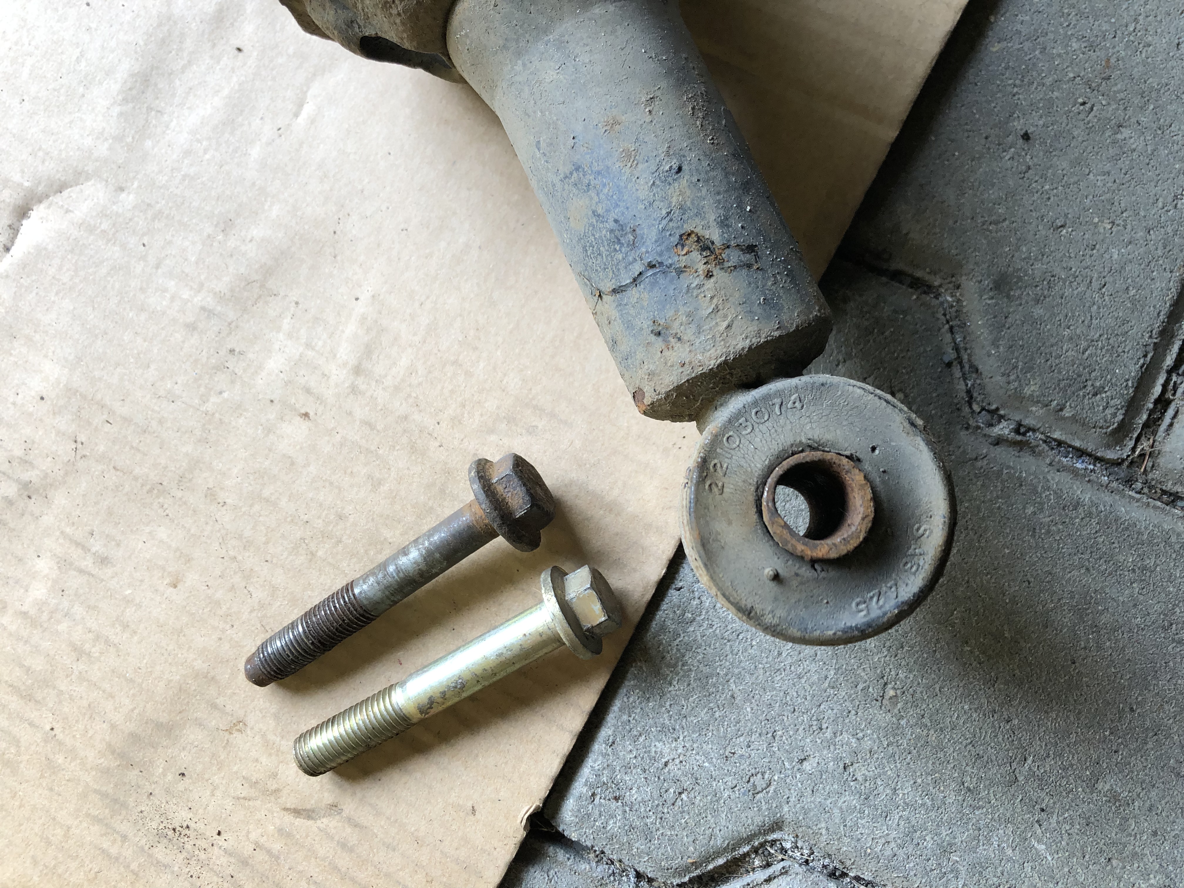 A pak jsem šel opět zkoumat zdroj rachotu ze zadní nápravy. Různě jsem heveroval, skákal v kufru a snažil se navodit situaci tak, abych to mohl nějak sám pozorovat. Nakonec se objevilo jedno škaredé lupnutí v momentě, kdy jsem vyheveroval auto oběma koly nad zem a zabral jsem trhákem za šroub kola. Celá náprava jakoby propadla o kousek níž. Nakonec se z toho vyklubalo to, co jsem tušil. Dutinka v dolním silentbloku pravého zadního tlumiče byla děsně vyžvejkaná od toho, jak tam někdo dal neoriginální šroub s menším průměrem v odsazení. Bohužel náhradní šroub jsem doma nenašel, ačkoli teoreticky bych dva měl mít. Tak jsem aspoň přelisoval z jiného tlumiče silentblok s dutinkou v lepším stavu a dal to zpět do kupy.