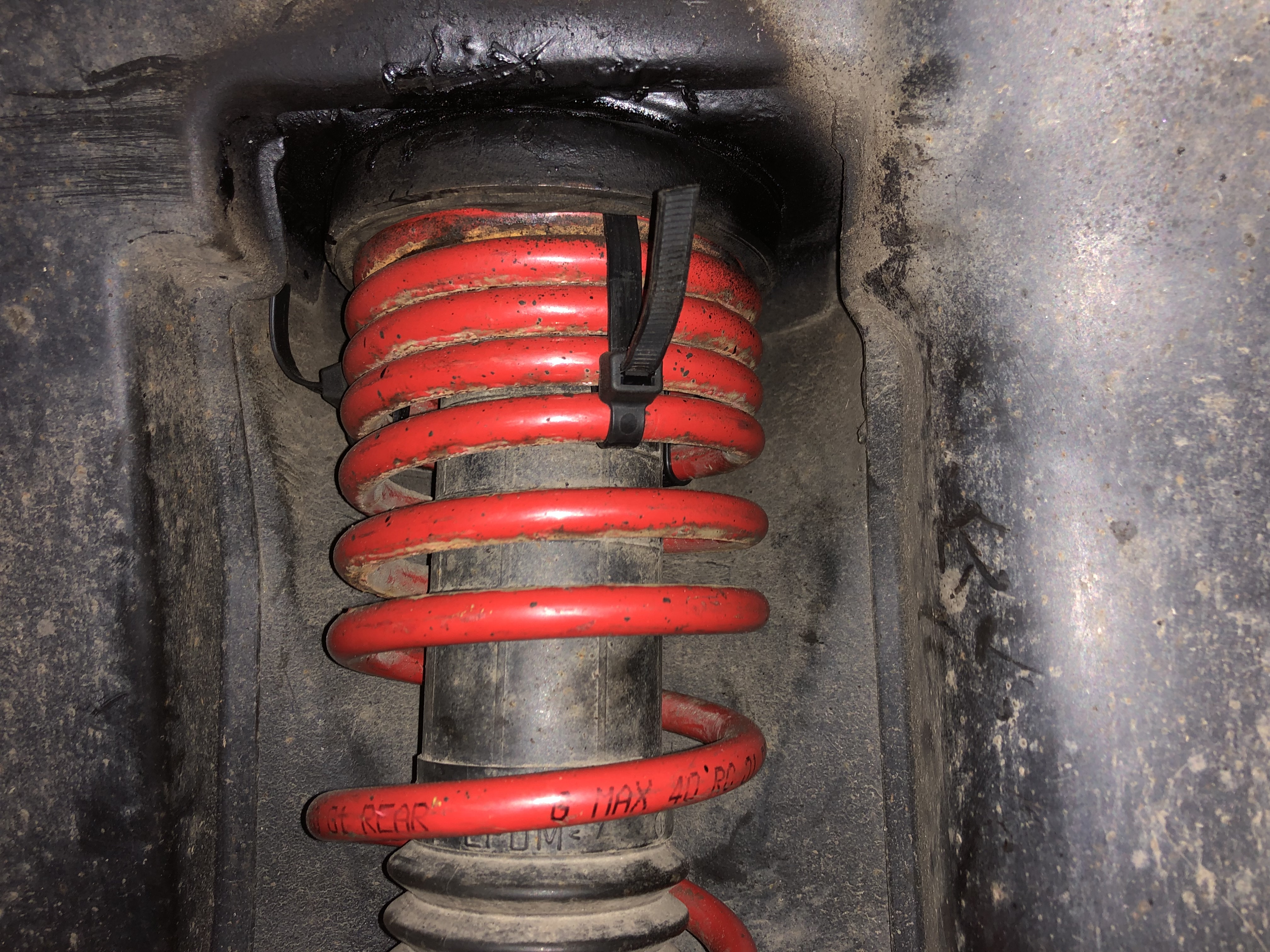 A mimochodem, po nějakém dalším týdnu ježdění bylo vidět, že pružina klepala o bok podběhu. Zřejmě se při propružení v mistě nějak propadla a vybočila se do vnitřní strany.