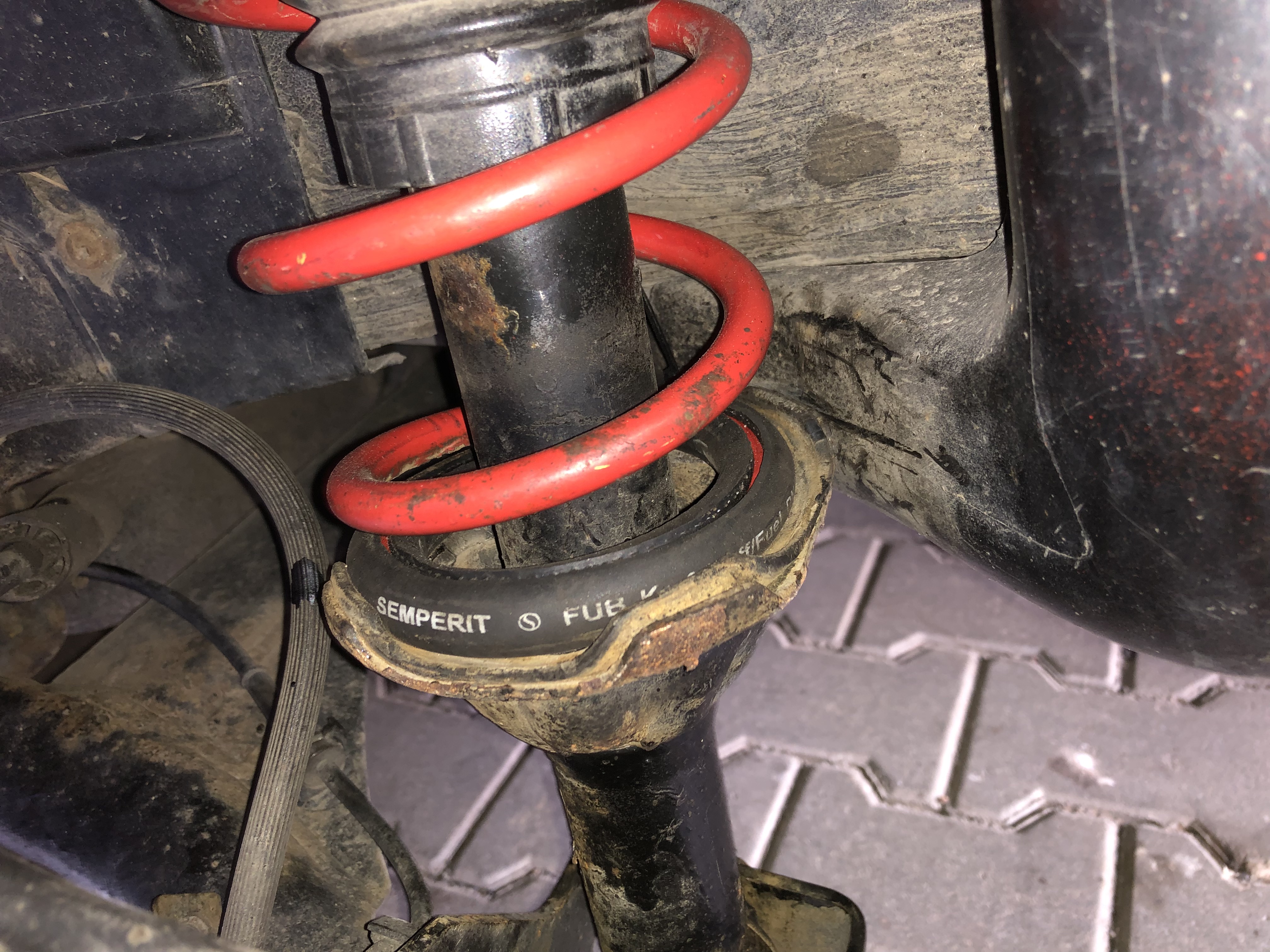 .... škoda že průměr díry byl malý na to, abych to na to navlékl, tak jsem musel hadici podélně naříznout. Ale jinak si to sedlo na závit hezky a v misce se vůle výrazně vymezila. Nahoře jsem pak po třetinách obvodu k sobě stáhnul 4 závity hustějšího závitu pružiny k sobě. Na autě jsem to ještě zmáčknul tak, abych bzuky pořádně dotáhnul. Od toho sice neočekávám nějakou životnost, ale chtěl jsem tím třeba snížit pružinu o to, o co se zvedla dole tou hadicí.