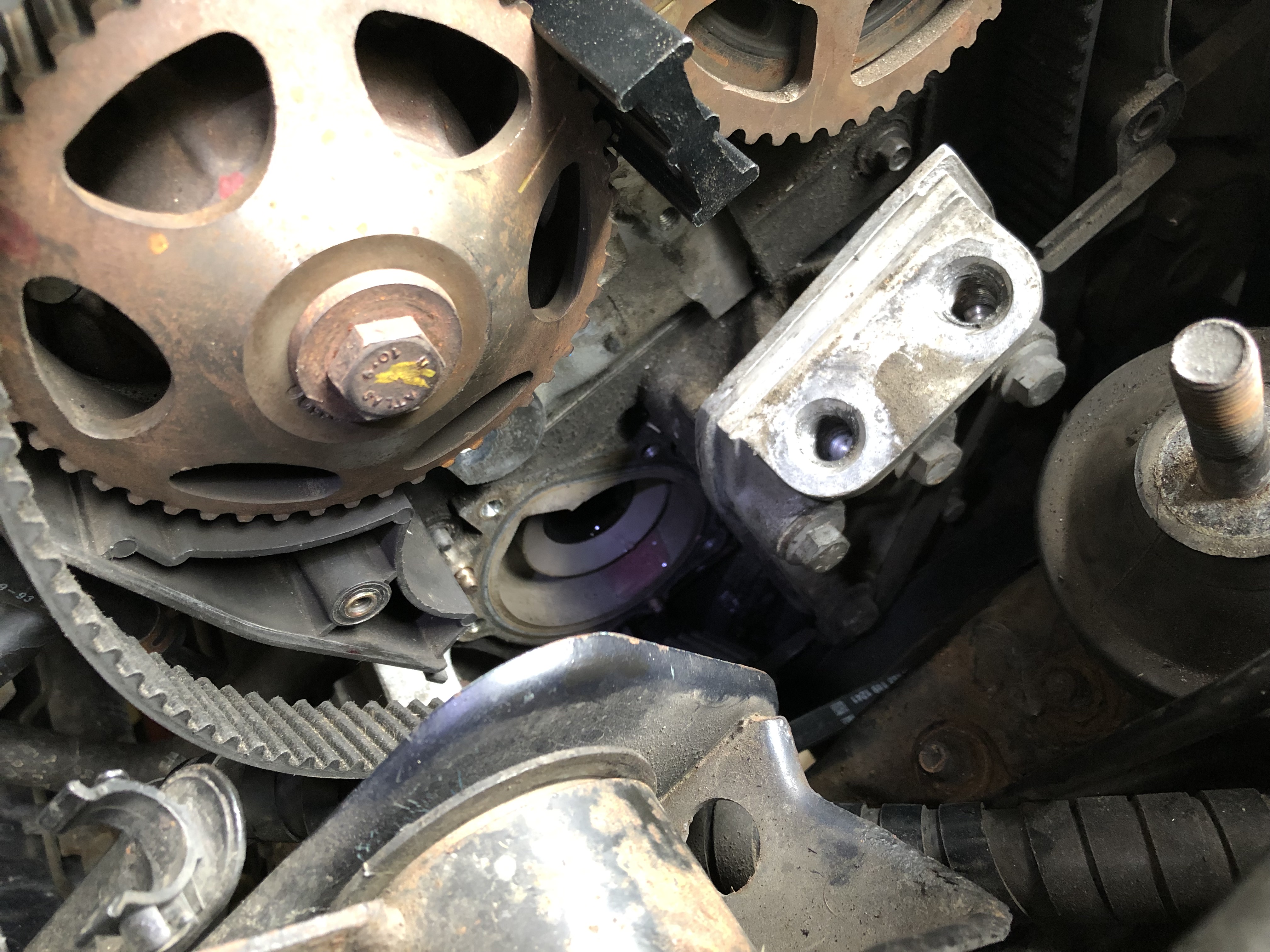 No, jsem tak na to chvilku koukal, jestli se mi do toho vůbec chce, protože ty šroubky pumpy jsou tedy hodně blbě přístupný a navíc já jsem nechtěl oddělávat dolní řemenice. Ale nakonec jsem se do toho pustil a skoro bych řekl, že výměna vodní pumpy bez rozdělání spodku rozvodů se dostala na vrchol "lakatoš" žebříčku