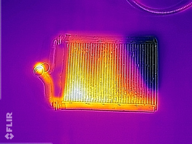 Takhle vypadal radiátor po napuštění teplou vodou pohledem termokamery. Čím světlejší barva, tím vyšší teplota (pro ty co to neznají)