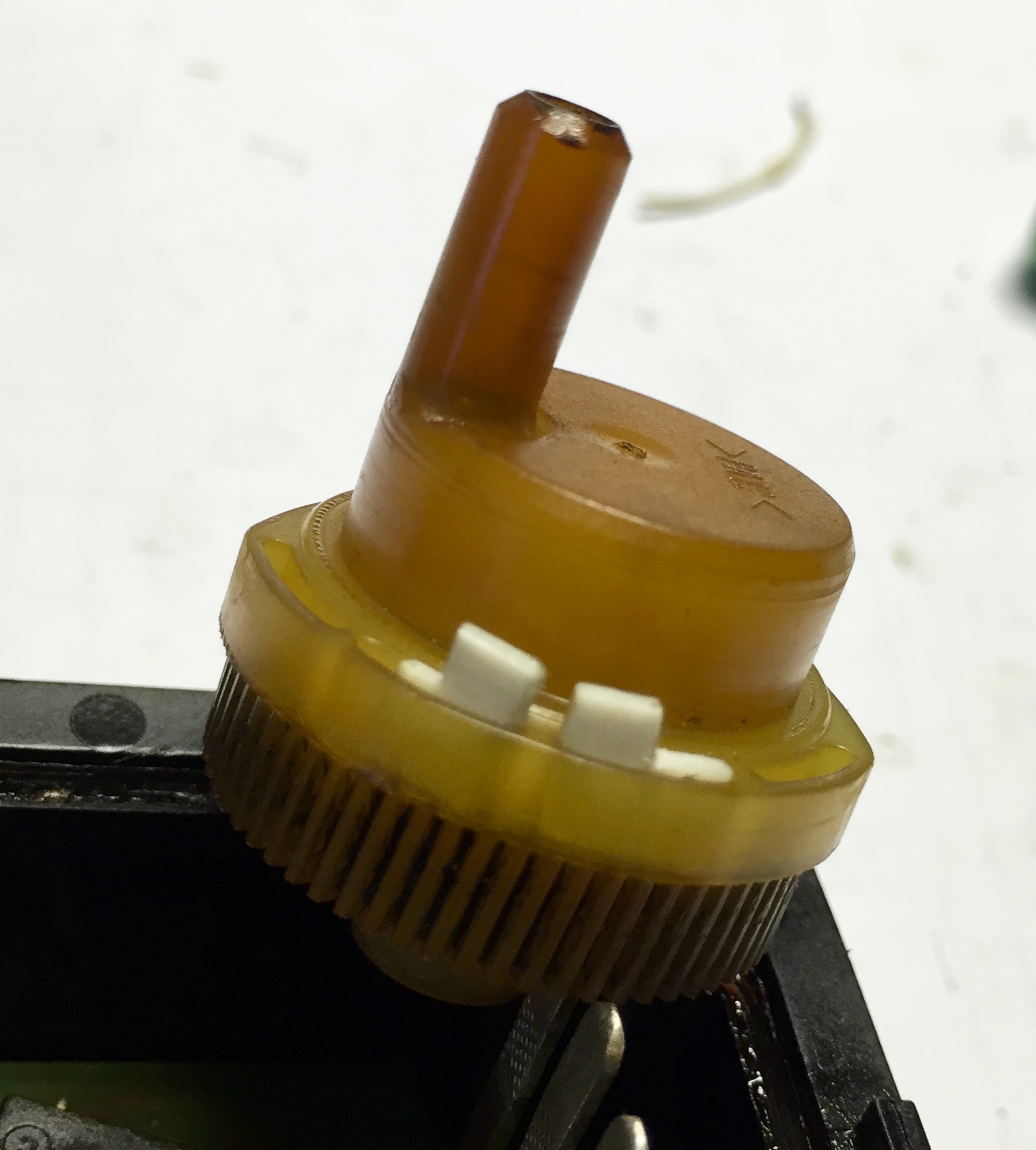 Zkoumal jsem jak to vyřešit, prvně jsem myslel že ubrousím na vačce tu vystouplou (spínací) plochu, čímž by se zkrátil pohyb a k druhýmu mikrospínači by to snad nedojelo, ale pak jsem si všiml že ta vystouplá část je dutá, takže bych se probrousil na hranu a byla by na vyhození. Když jsem nad tím špekuloval, tak jsem si všiml, že v těle VISu je pod tou vačkou vyfrézovanej doraz, kterej odpovítá ty objetý trase vačky, ale z ní nekouká nic, co by ji v těch koncovejch polohách zarazilo. Tak jsem to musel dodělat.... Použil jsem kousek plastu, kterej přesně a docela festově zapadl do dutiny tý vystouplý plošky. Navíc teď ta vačka zastavuje přesně v poloze o 180 stupňů proti výchozí, když to bylo bez dorazů, tak přejela koncový polohy a tím pádem se vždycky trochu vrátila druhou stranou.