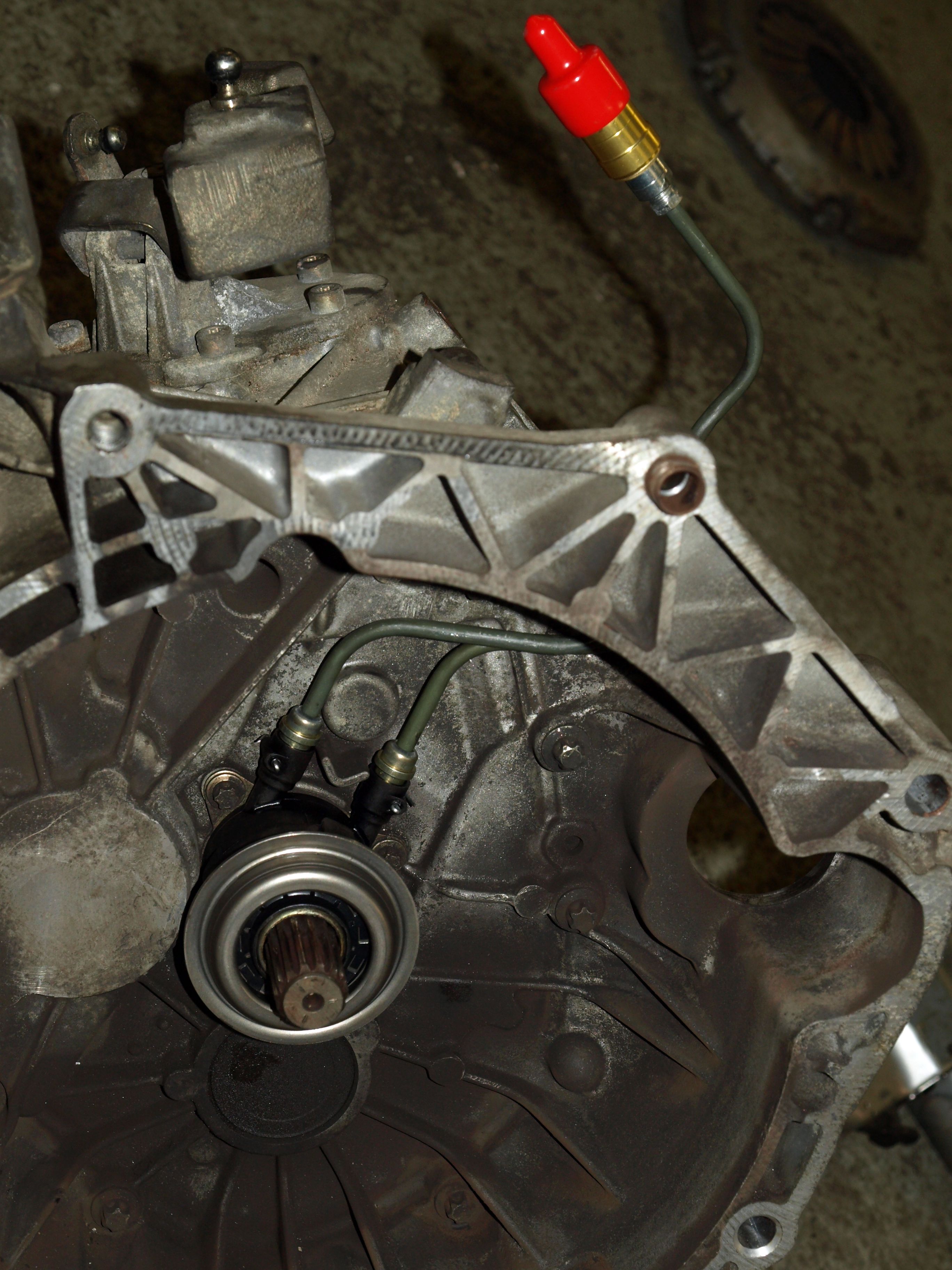 ), nové hydraulické ložisko. Šup to tam. Na závěr jsme bojovali s napumpováním hydrauliky a po půl hodině marného pumpování pomohlo upustit kapalinu odvzdušňovákem. Tenhle problém značil to, že válec na pedálu není už v kondici.