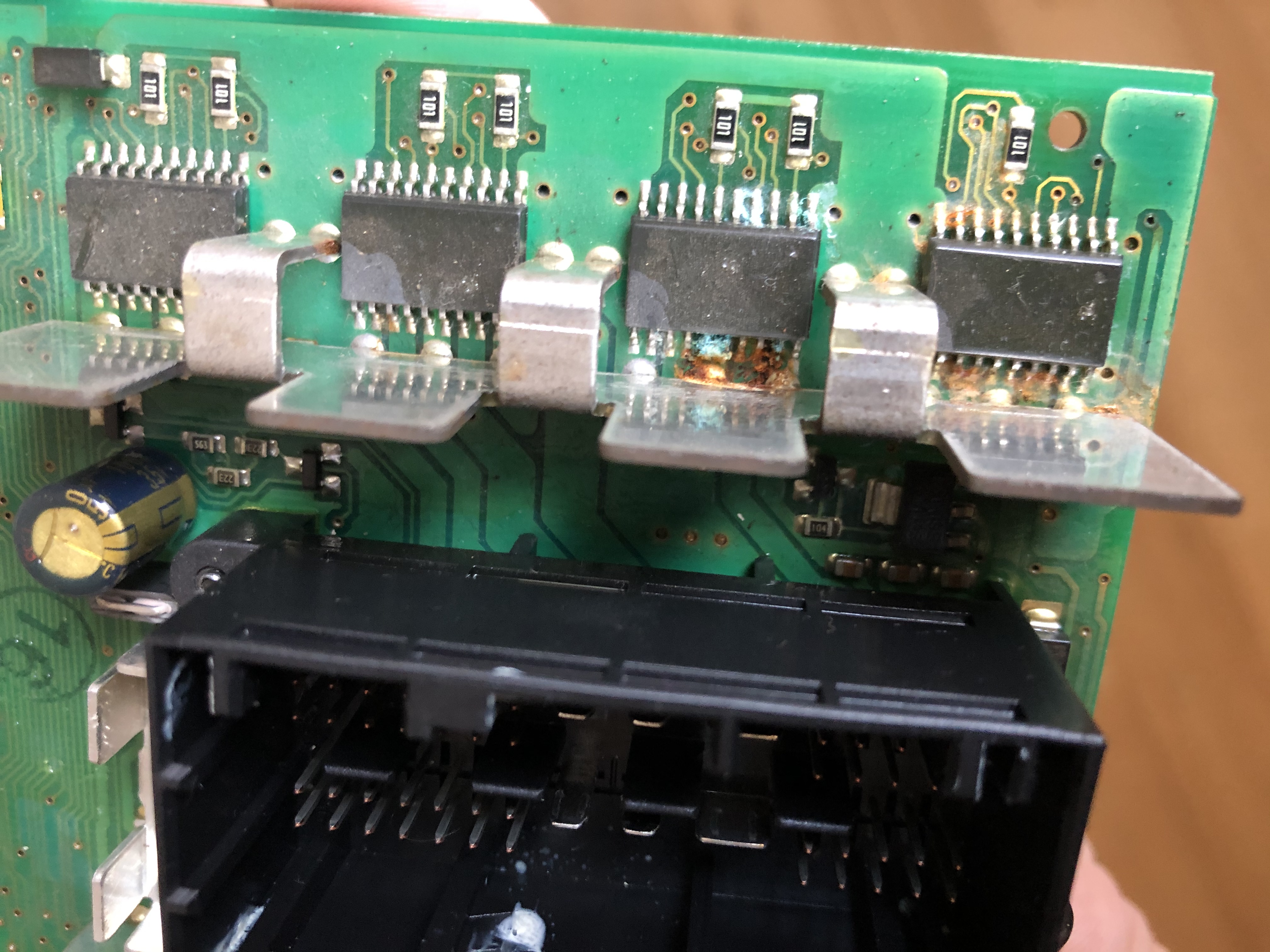Tedy jednotku jsem vyčistil, propájel, zalakoval a na to vyboulení nad ní jsem nalepil kus tuhé fólie tak, aby to udělalo stříšku a případně to kapalo až za jednotku na plastový kryt nad pedály.