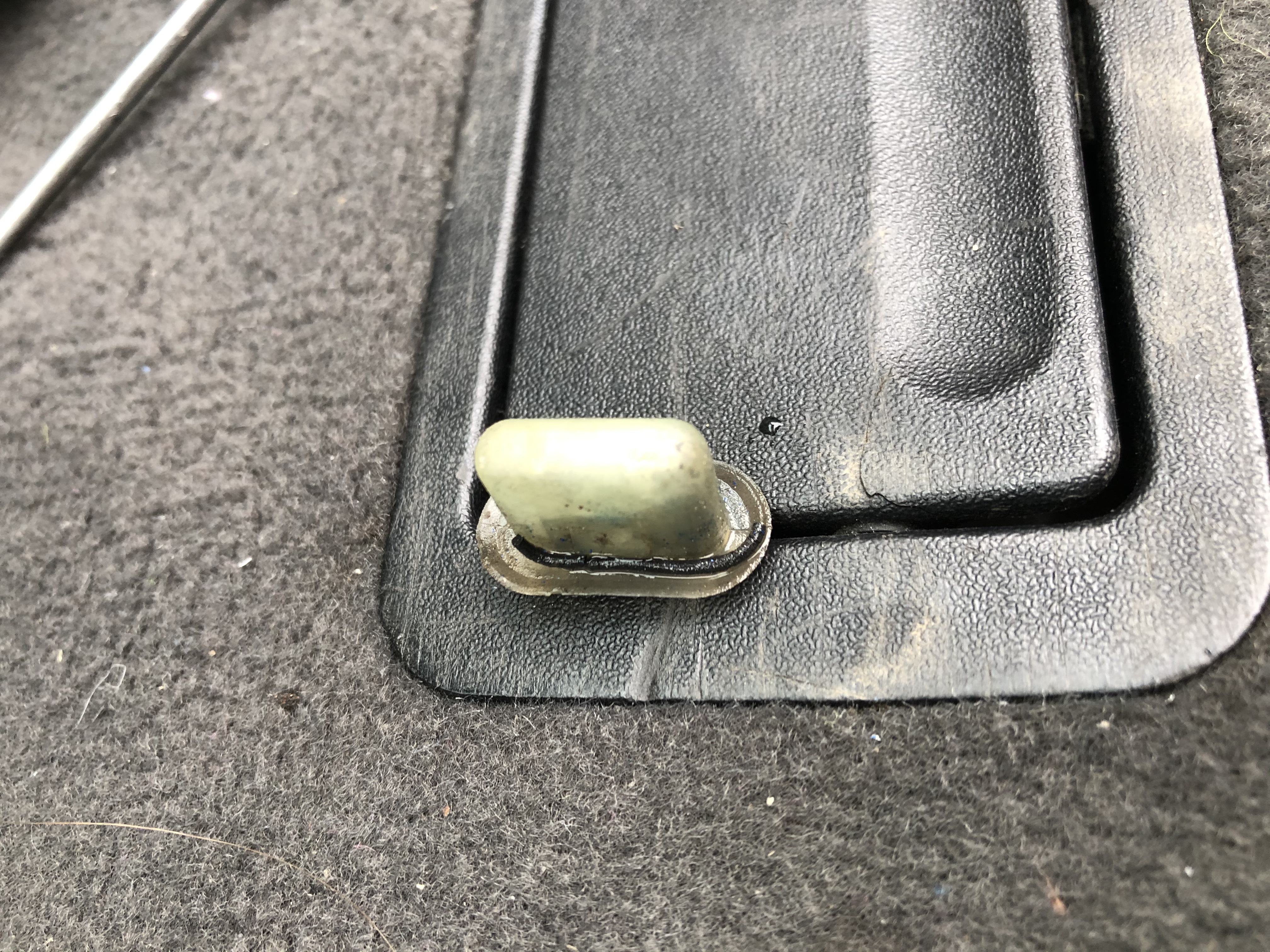 Další věc, co se mi nelíbila, byl ten plast nad kufrovým otvorem, který kryje to čelo. Do plechu je to upevněné v takových plastových vložkách s kovovým klipem. Ty vložky jsou uzavřené a kolem dokola měly kdysi cosi jako gumový O kroužek, který už ale dávno zpuchřel. Bohužel kromě jednoho úchytu jsem ten krycí plast z tama urval, ale to fuk. Vydloubal jsem ty plastový vložky všechny ven a otvory po nich jsem zkusmo přelepil silikonovou lepící páskou.