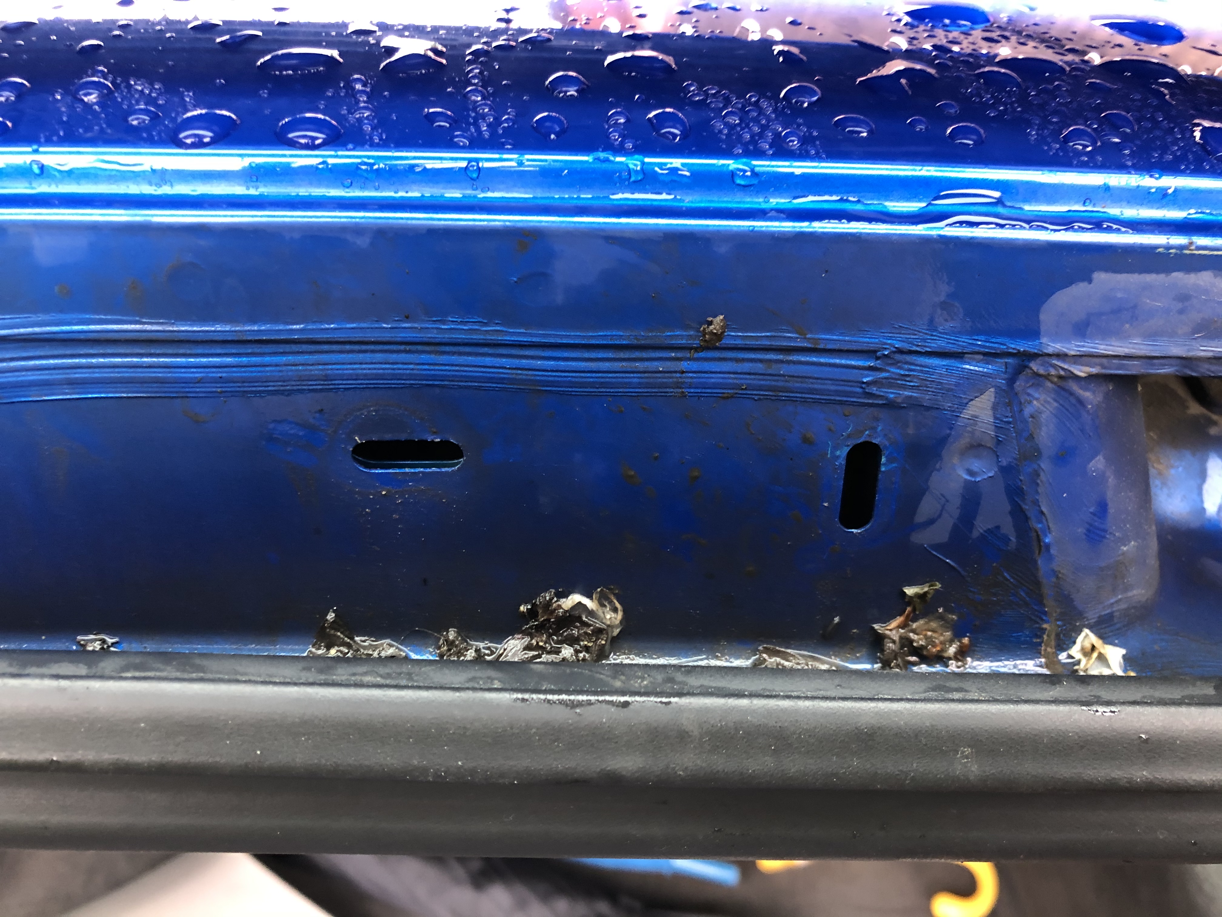 Prasklinky, ta zdní mufna hagusu se vyšroubovala z karoserie, takže ta tam dost možná byla leta volná a kolem ní se to fostávalo mezi plechy. A nad předním sklem pod lištou taky praskliny v tmelu ako prase... no mám co dělat. Večer dám detailní info