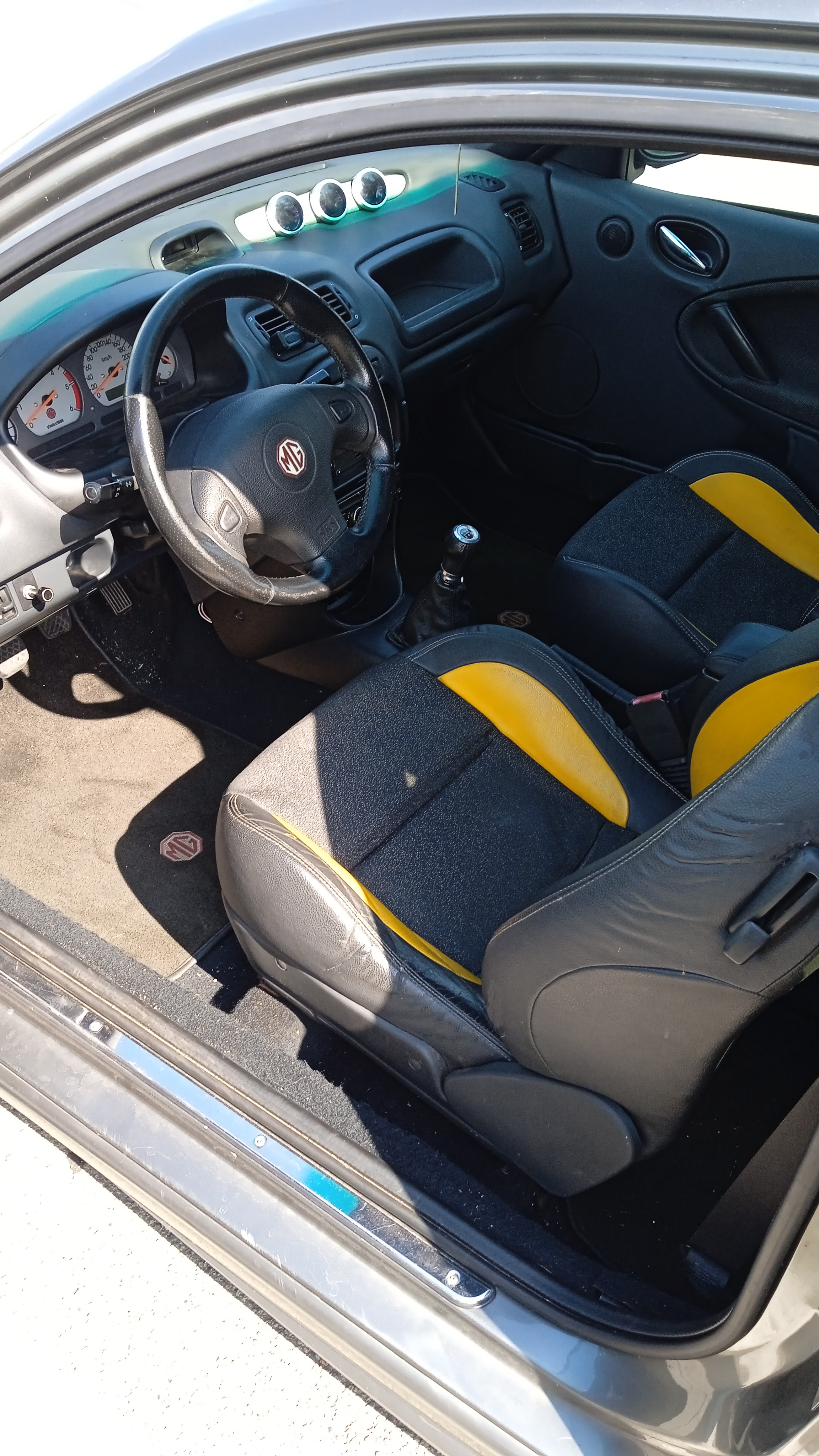 Přídavné budíky tlak+teplota oleje a tlak turba (nakoupená nová čidla), volant z MG F, loketka z Coupe, žluté sedačky ze ZR s nájezdem 100 tisíc v pěkném stavu, stropnice a stínítka přečalouněná na černou, interiérové plasty též komplet černé.