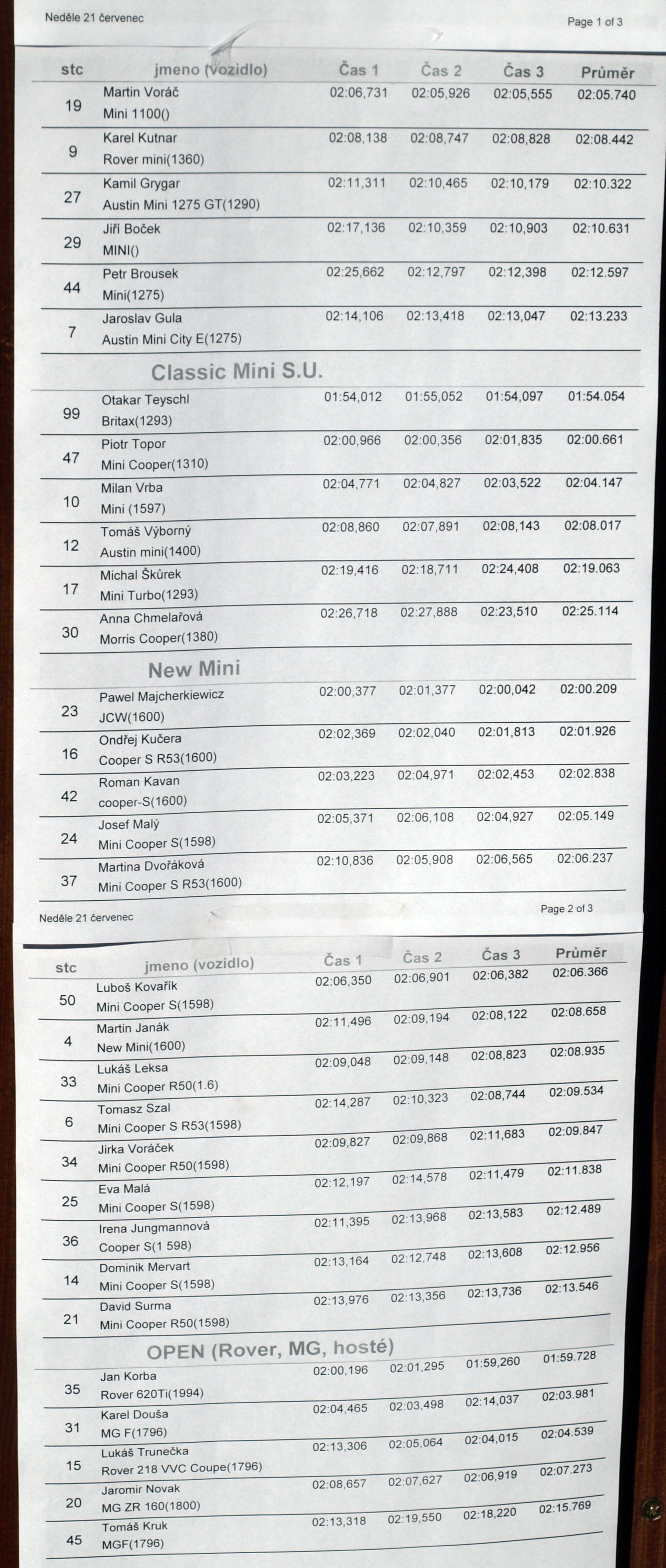 První ostrá jízda byla zklámání. V první levotočivé zatáčce mi uletěl zadek a já to otočil do protisměru :-D Naštěstí mi motor nezdechl, tak jsem to hned vrátil zpět a uháněl dál... v cíli jsem byl ale zklamaný, nicméně poučený, že první kolo musím před ostrýma zatáčkama brzdit striktně včas, protože gumy byly na startu studené a bylo to opravdu dost znát. Hned jsem taky do kufru vrátil rezervu, protože zadek auta potřeboval trošku přišpendlit. Velké a milé překvapení bylo po zveřejnění časů, kdy s časem něco málo přes 2:13 jsem i přes hodiny byl na tom velice dobře... po odečtení ztráty kolem 7 sekund to vypadalo na velice slušný potenciál... takže do další jízdy jsem šel s tím, že musím jet více hlavou, tak jak mi to doporučil Karel :-)