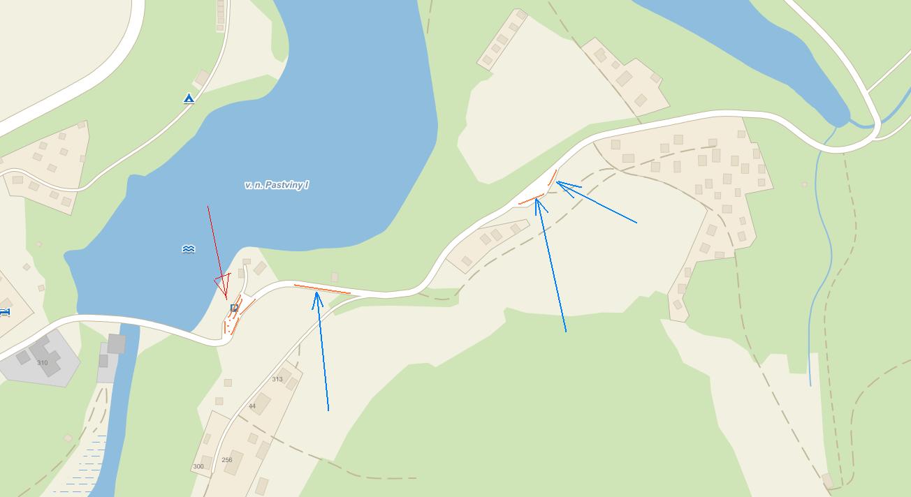 červená šipka značí hlavní parkoviště kam se pokusíme vtěsnat, oranžové línie s modrýma šipkama značí kam se dá ještě zaparkovat.
