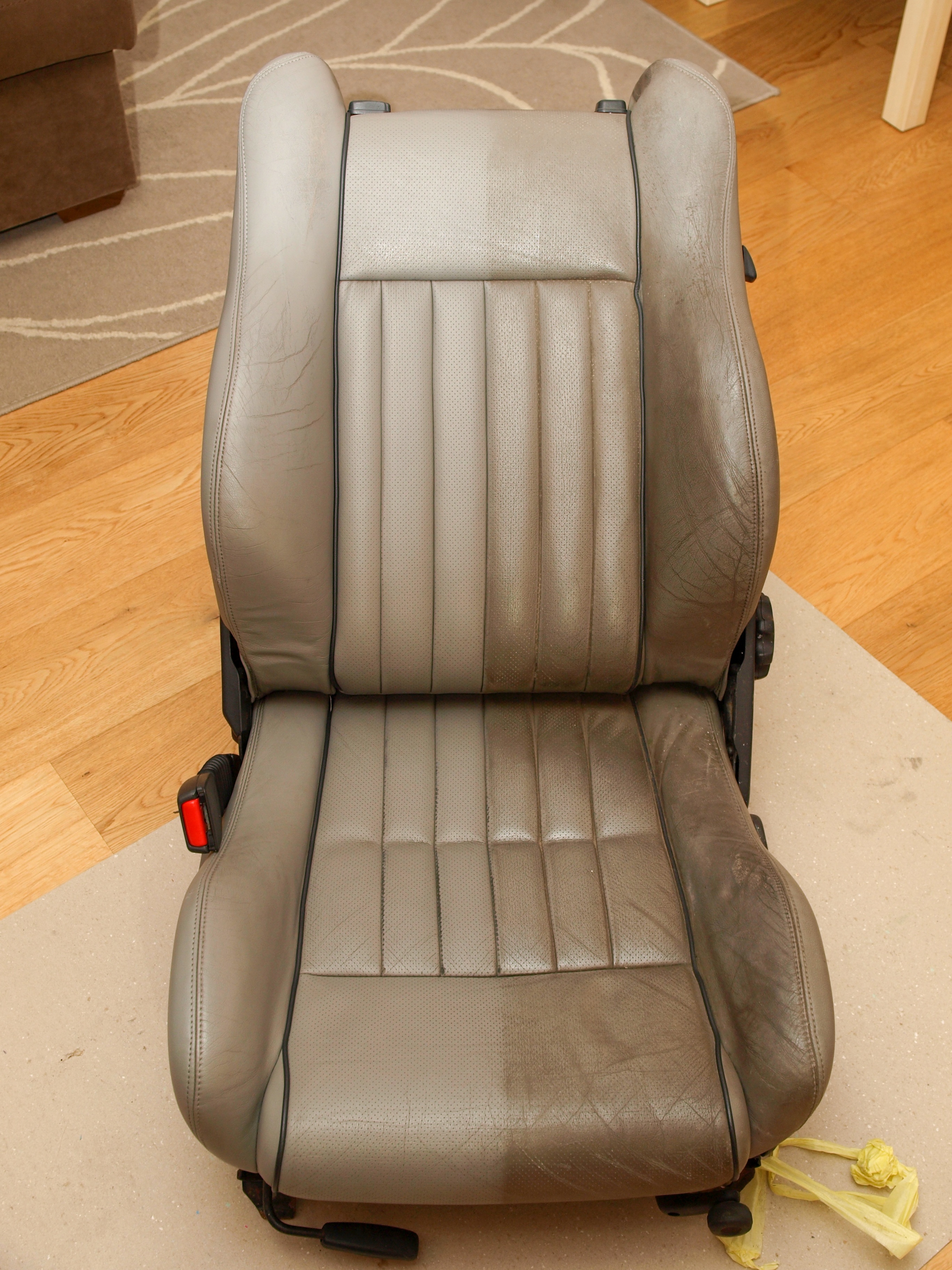 Stav sedaček... no... z kabria a původní majitelé asi totálně dlabali na to, že by se o kožené sedačky mělo nějak pečovat. Takže totální hnůj viz. foto. Nicméně pod tím humusem jsem neviděl nijak moc zásadních vad. Spolujezdcova sedačka má natrhlý kožený bok sedáku. Zadní sedák je propálený. Šoférova sedačka má kvůli nulové péči ošoupanou barvu. A jsou orezlé úchyty do podlahy. Klasika...