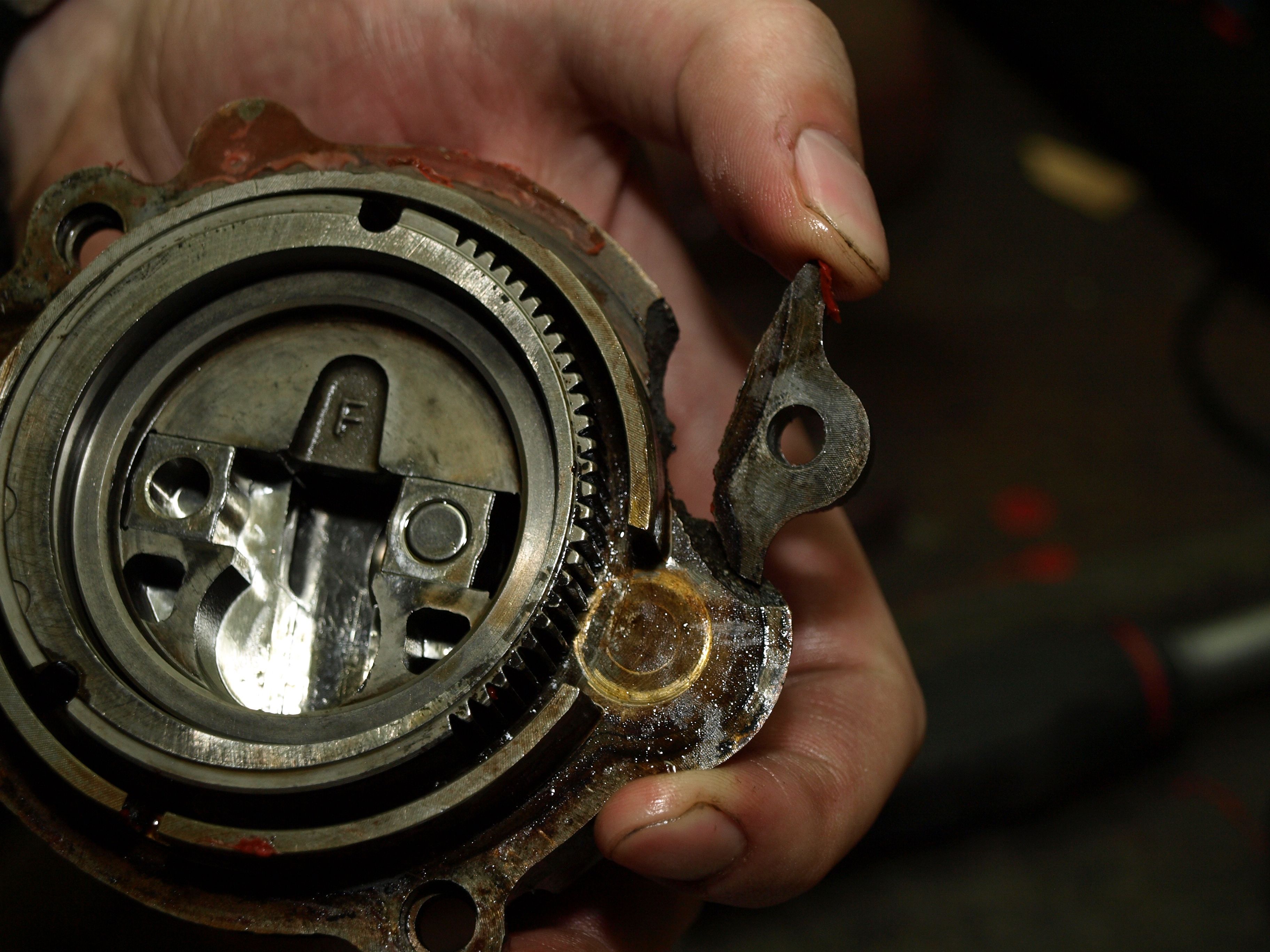 Pak jsme se dostali k tomu rozebrat VVC mechanismy. Ona to není zas taková hrůza a v podstatě sestavit to blbě snad ani nemůže jít. Snad jen to umístění do výchozí polohy by se někomu mohlo povést blbě a třeba i na každé straně jinak. Uvnitř to vypadá dobře, bez viditelných škod. Až tedy na jednu zpáchanou nějakým nemožným kutilem. Koukněte na fotku. Kostička, která chodí v drážce a je udělaná jinak opravdu hodně přesně, tak někdo ji z nepochopitelného důvodu obrousil na brusce a to tak, že zbrousil její hrany, ale dokonce i tu přesnou plochu. Takže oproti těm zdravým tahle kostička v té drážce viditelně kvedlá. :puke: No ta rozhodně použitelná nebude.