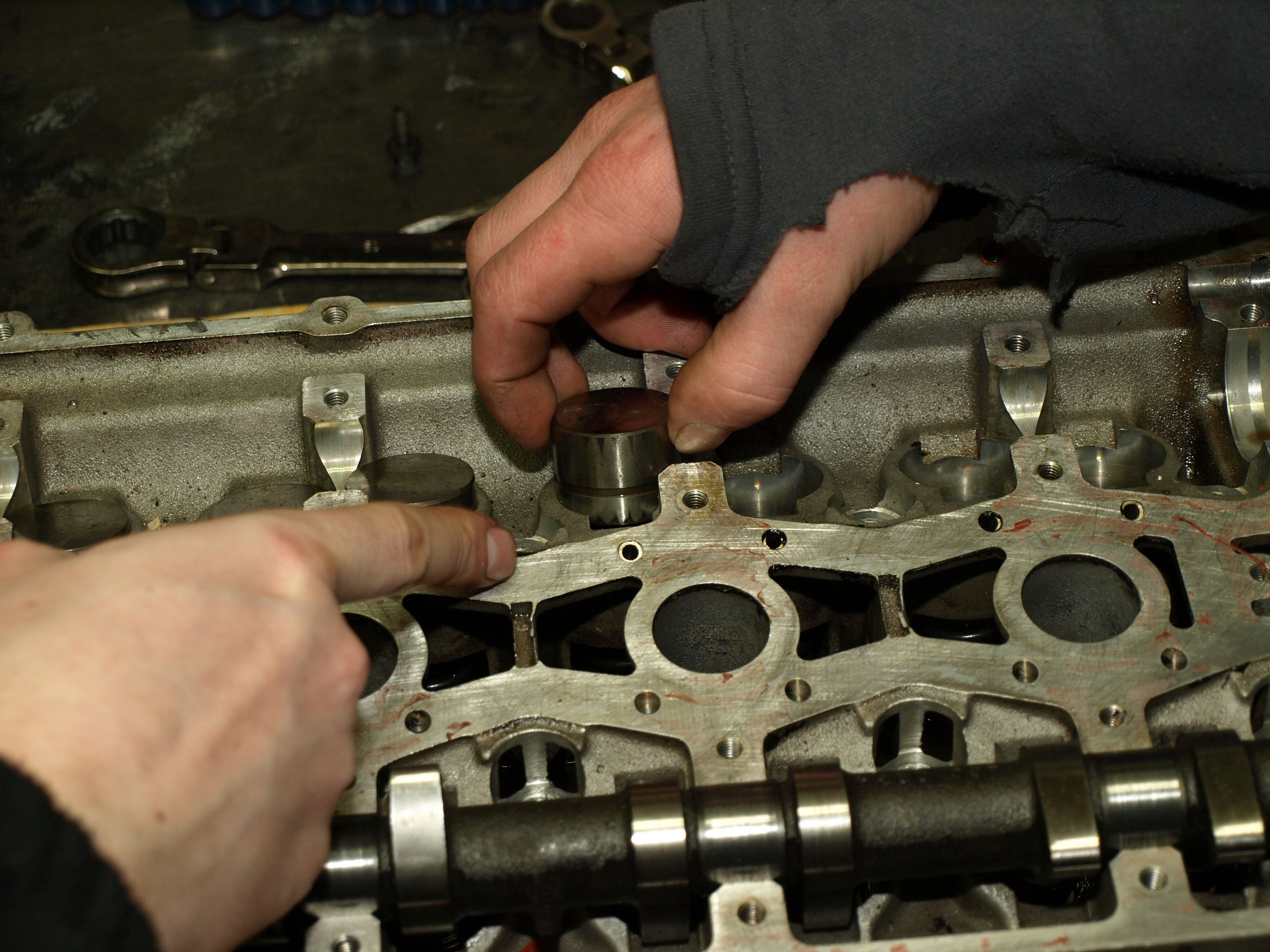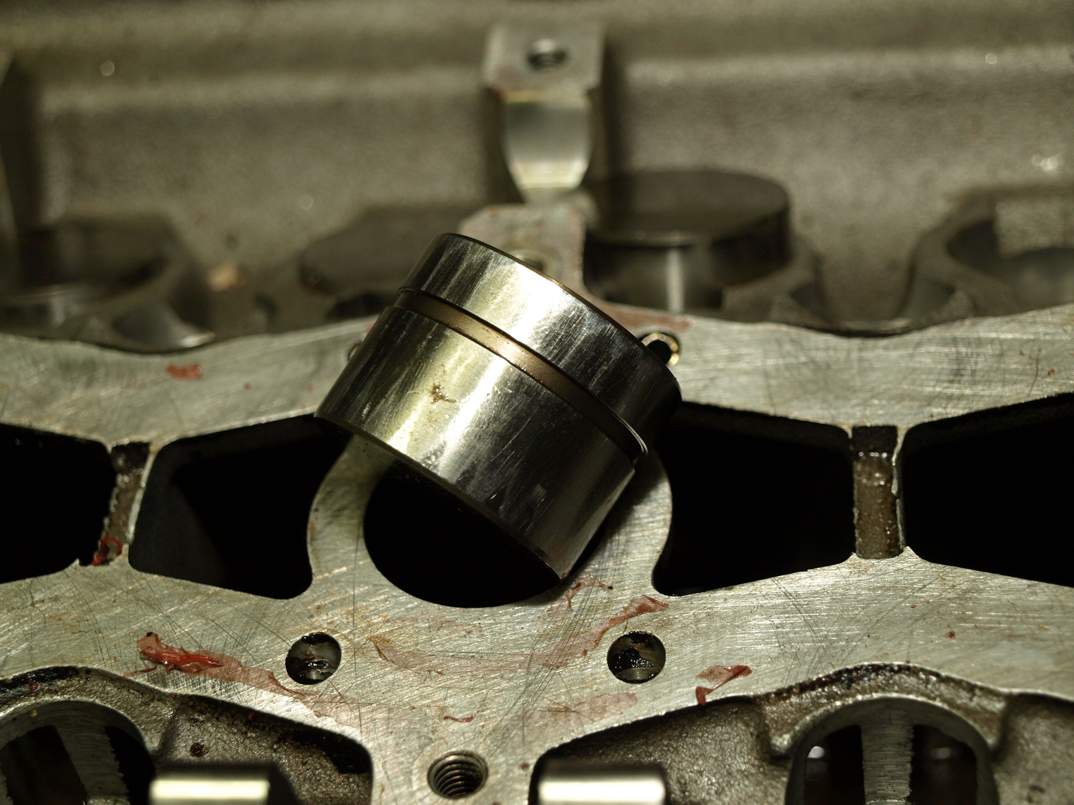 Postupně jsme vyndavali hydroštely. Nejprve výfukové... z osmi asi dva mají tuhý cumcrlík a u ostatních jde propružit dovnitř tak, že se vrátí do původní polohy. Ty tuhé hydroštely jsou asi KO a nic s nimi nenadělám, že? Překvápko čekalo ale u sacích hydroštelů. U dvou až tří jsem zjistil, že jsou sjeté do tisícihranu + cca dva jsou tuhé. Ty tisícihranné jsou použitelné (tuhé nejsou)? Blb jsem si tedy nezapamatoval kde byly, takže nevím která vačka do nich bušila. Nicméně na těch krajních vačkách je vidět, že jsou sjeté nějak křivě - což by tedy mohlo být třeba tak, že ty hydroštely měly vůli, chodili vyosený, tím se oleštili do tisícihranu a tím se vačka sjela křivě. Je to tak? Vačky asi použitelný nebudou, že? Jak jsem říkal, budu rád, jestli spolu s těmi mými hydroštely vytvořím kompletní funkční sadu.