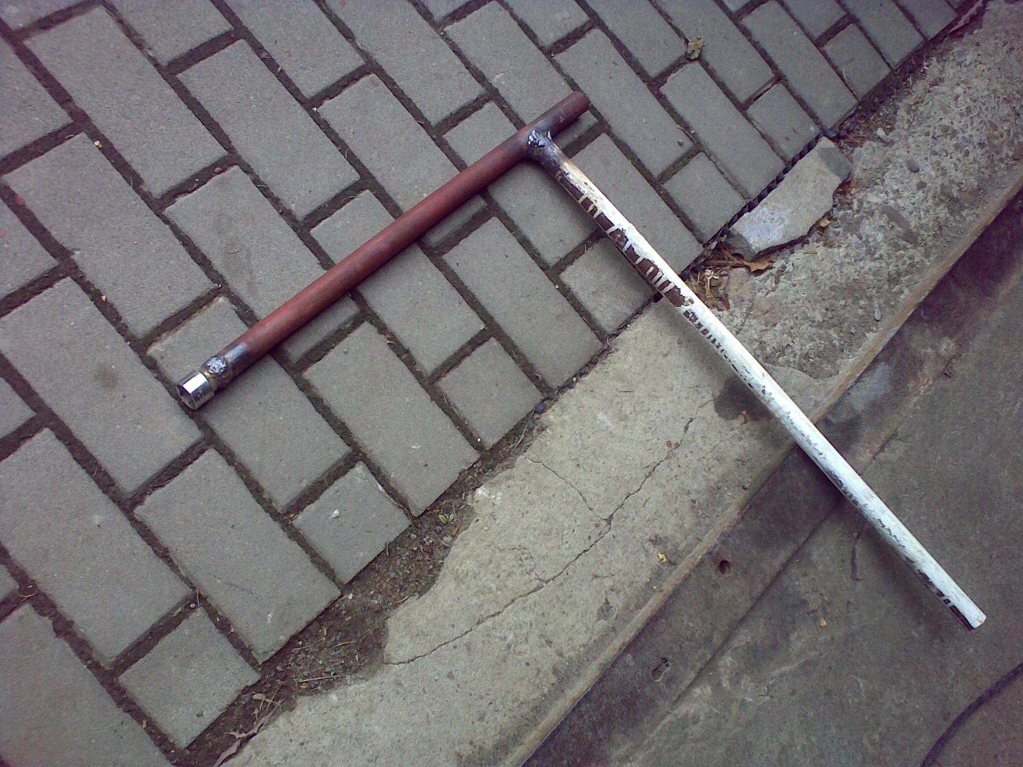 Padl na to jeden 22 ořech a cca metr a půl staré trubky z topení. Svařili jsme to tak, aby páka byla dostatečně mimo auto a aby se konec dal opřít o špalek a dalo se tak pohodlně zabrat. Na zajištění setrváku jsem napřesno piloval silnější kulatinku, načež tímto se podařilo šroub povolit luxusně.