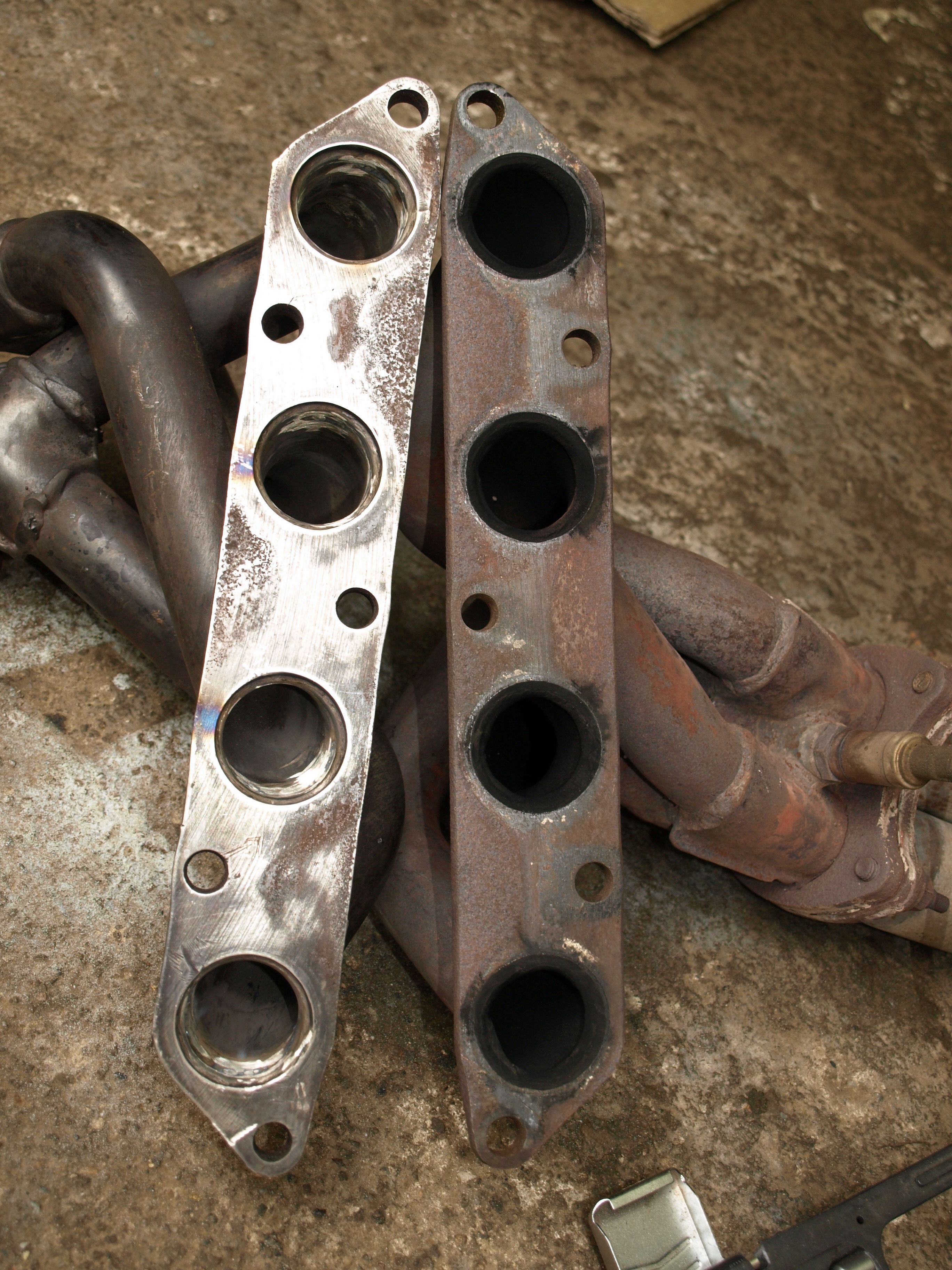 Všechno celkem pěkně odsejpalo. Kamarád mi už včera obodoval trubky na svodech. Spolu jsme odměřili novou část výfuku vůči střednímu dílu, který byl potřeba zkrátit až téměř k tlumiči. Bohužel ta restrikce je tam brutální (viz. foto). Dvoj dírová příruba na katu měla rozteč 10 cm, takže jsem na půdě vyštrachal jakýsi starý první díl a z něho ufiknul přírubu i s kusem trubky, která se navlékla na trubku středního dílu. Tím jsem mohl nastavit optimální délku a úhel a nabodovat. Po sundání středního dílu se nám díky tomu podařilo tu restrikci udělat aspoň trošku pozvolnou. Nicméně je to šílený rozdíl v průměrech trubek, takže ten střední díl to fakt bude chtít sehnat brzy.