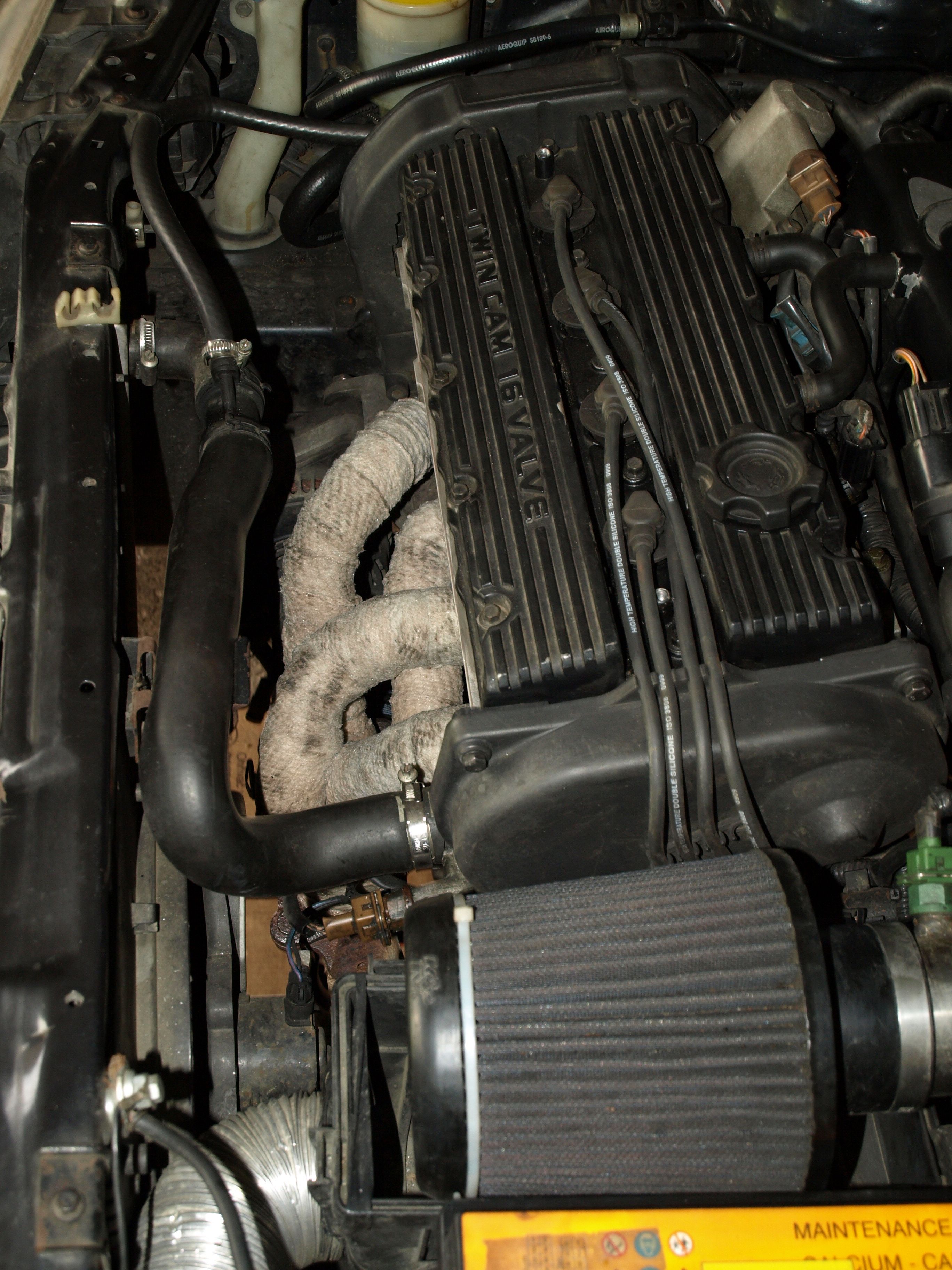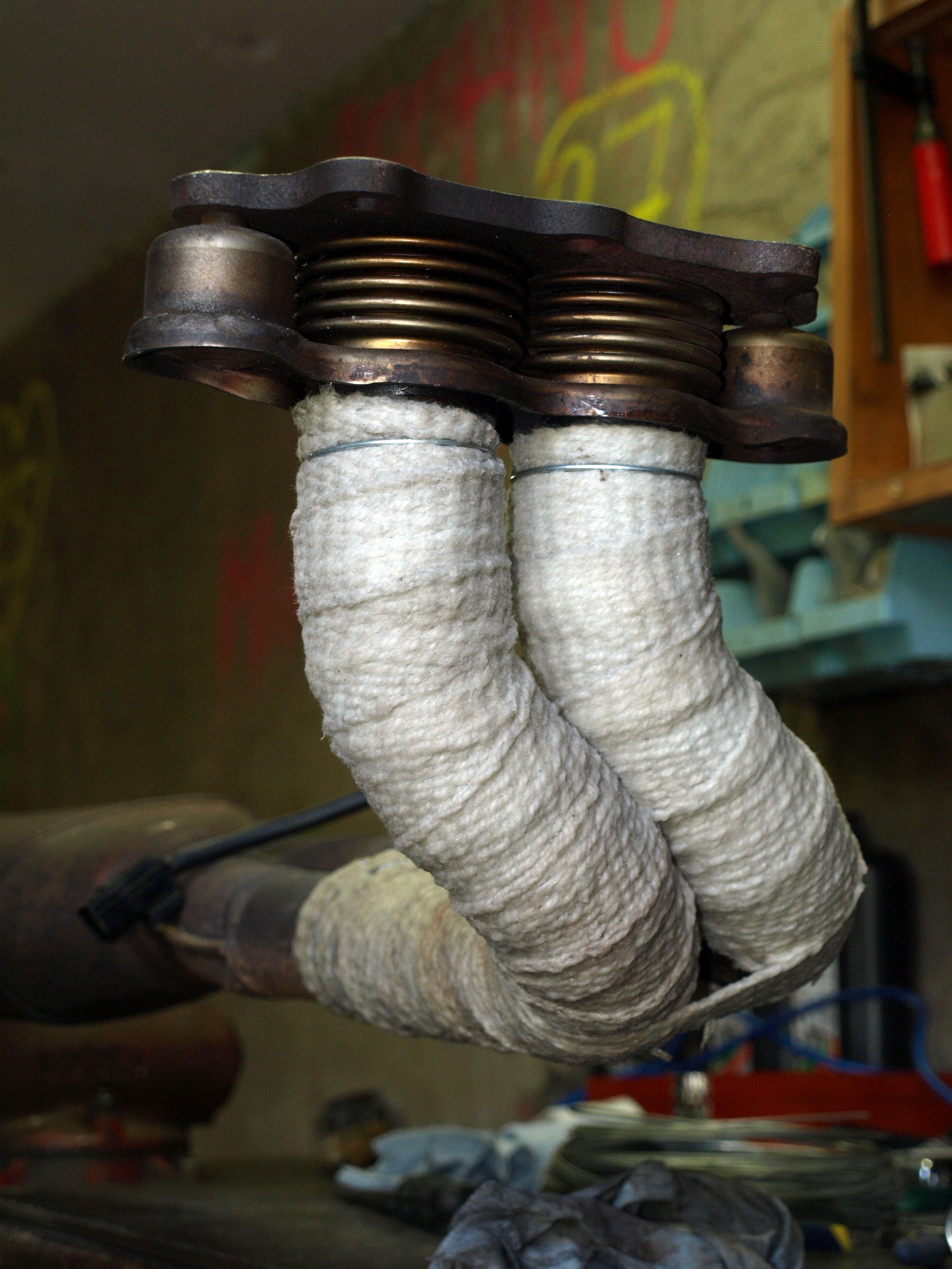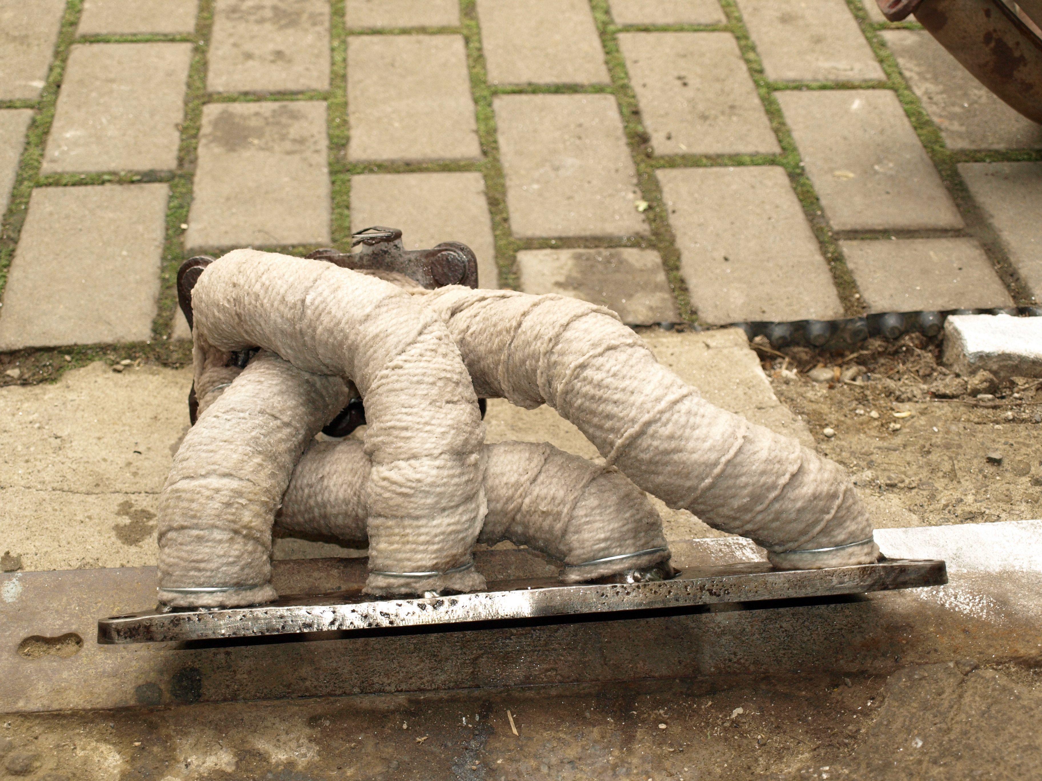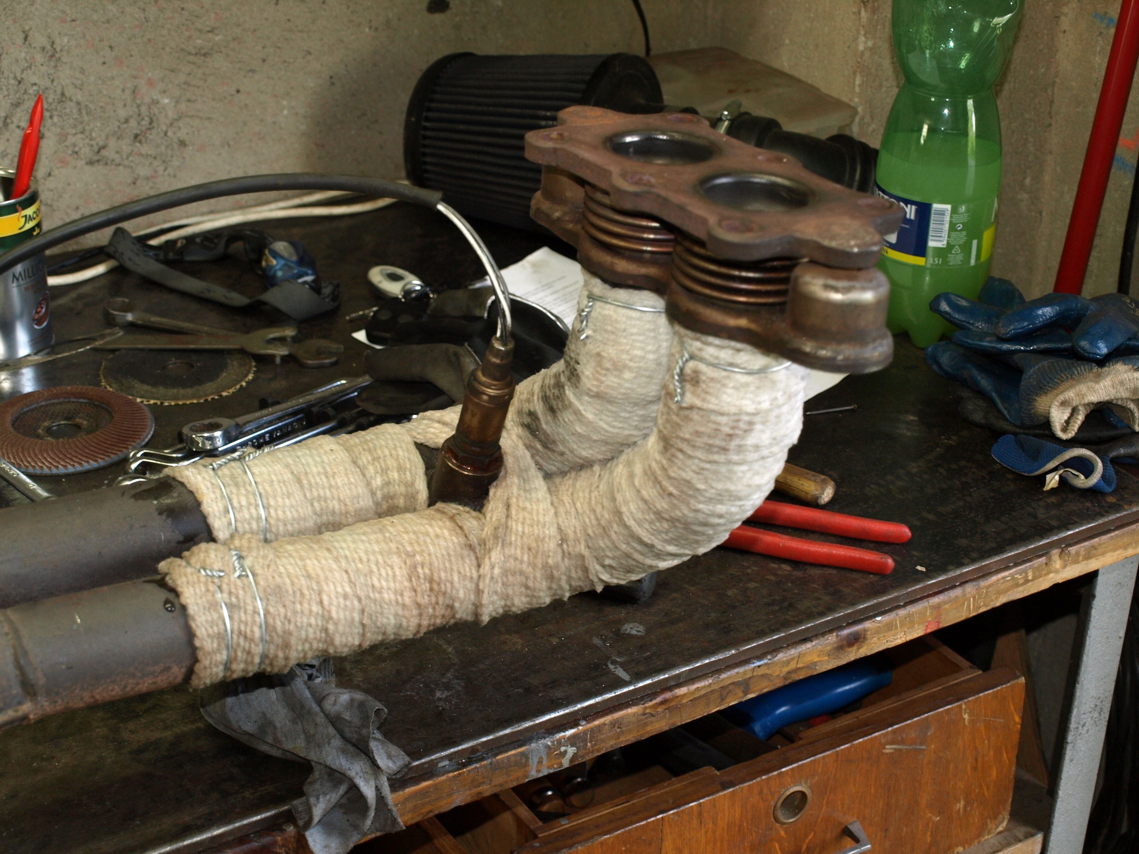 Omotal jsem svody a část prvního dílu od svodů. Po té jsem to řádně nacucal vodním sklem no šlo se na montáž. Byl celkem mor sám pod autem na špalkách se mordovat s těma těžkýma trubkama, ale podařilo se. Smontováno bylo a tak jsem si dopřál prvního nastartování a čoudu z omotávky