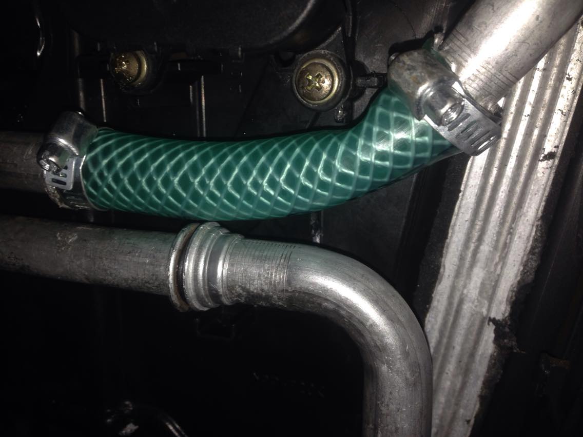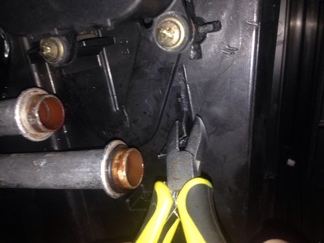 Pak přišla operace kompletování. Horní příruba klasicky nešla sesadit. Neměl jsem na to náladu, takže jsem uřízl kus trubky topení a nasadil hadici 5/8. Sedlo si to akorát, ani nebylo třeba řezat trubku v autě, což by by byl bez flexy asi velkej problém. Ta zahradní hadice, která má teplotní trvanlivost do 40 st. mi vydržela bez problému asi tři dny, než jsem sehnal teplovodní hadici 5/8 za cca 80kč/metr. Pracuje se s ní dobře a při příštím čištění už to nebude taková pakárna. Pro lepší manipulaci jsem ucvakal takový plastový výčnělek, který tam je podle mě uplně zbytečně.