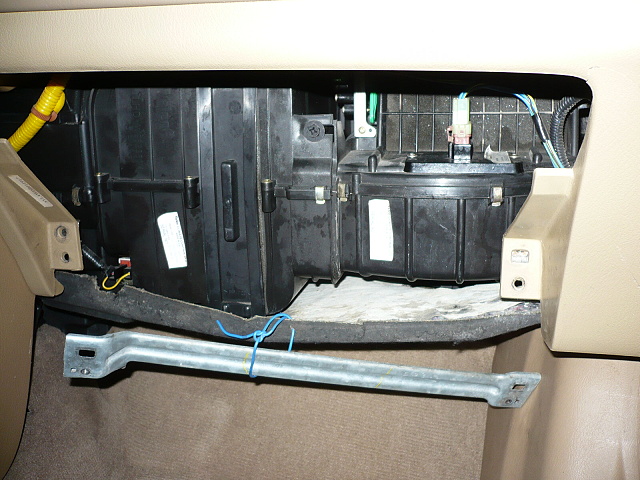 Napřed bych ale změřil, jestli jde po zapnutí klíčku do vetilátoru +12V - jeden z těch modrých vodičů do motoru ventilátoru. Ale kostru při měření použij někde z karoserie. Pokud ano, zkus spojit kostru s tím druhým (!) vodičem, měl by se ventilátor rozběhnout. Pokud ne, je něco s tím motorem ventilátoru. Může být jen zaseklý vlivem smetí, které se tam dostane. Rozborka je jednoduchá viz foto: