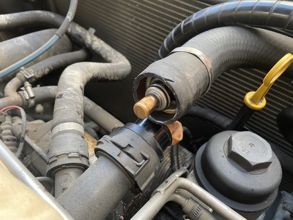 Tak jsem se k tomu konečně dokopal. Oprava termostatu. Teda spíš doplnění novýho do horní hadice. Mám ho koupenej snad už dva roky a konečně na něj došlo. Po nastartování šlo teplo do kabiny snad po dvou minutách a už i ručička teploměru vylezla kam má.