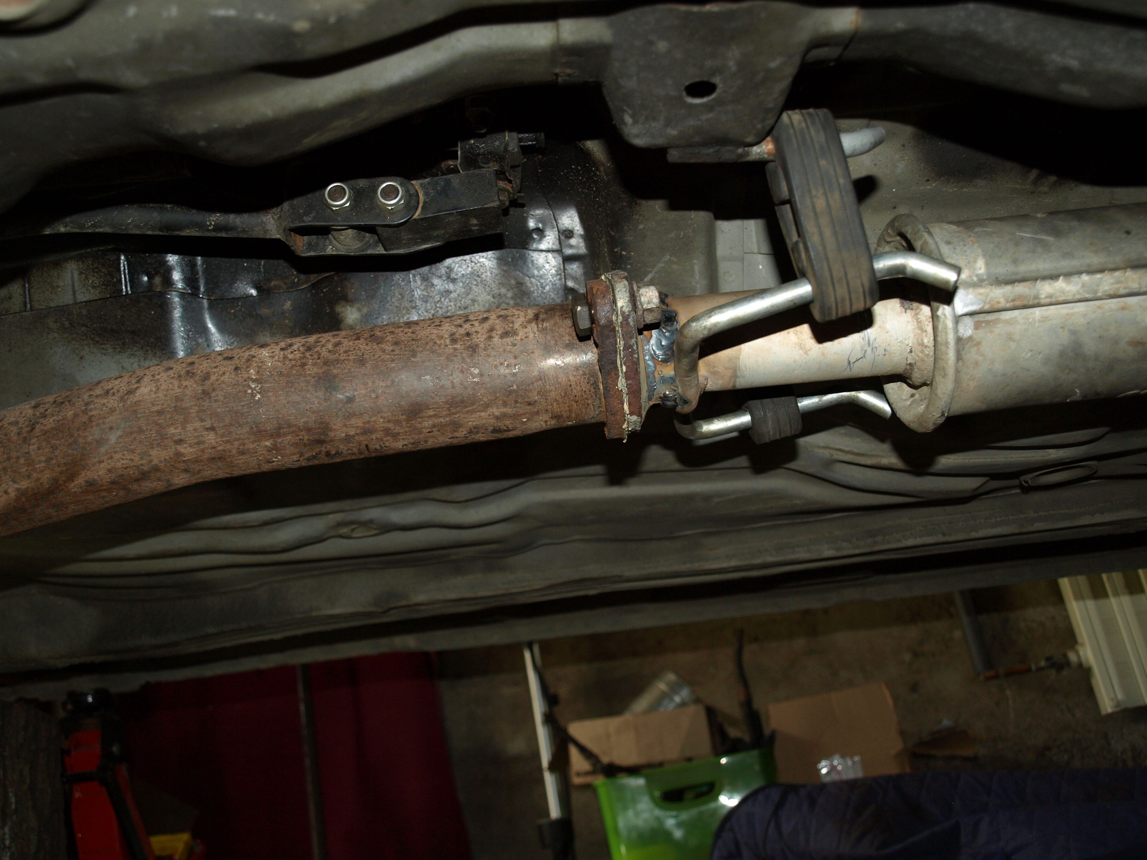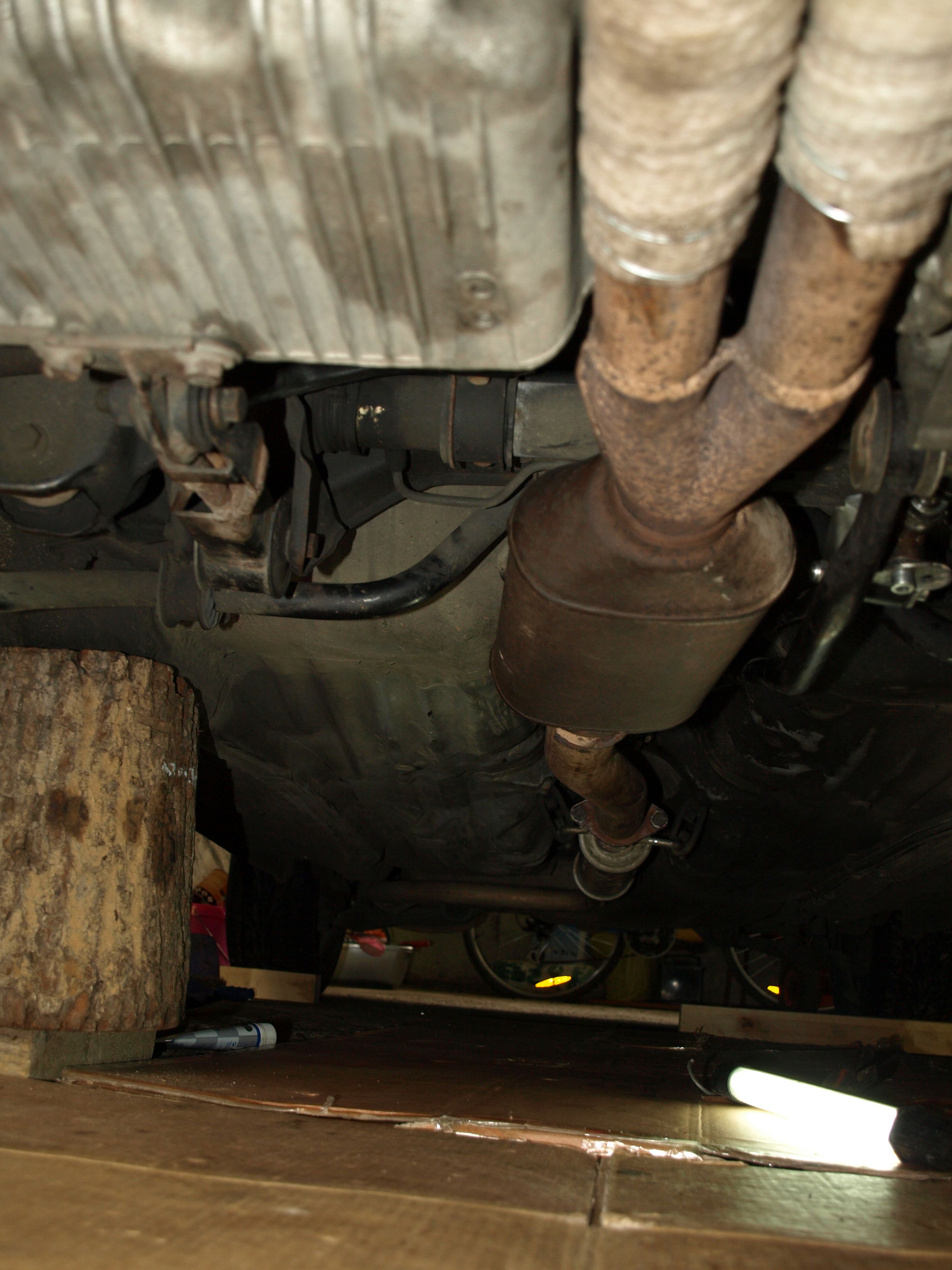 Všechno celkem pěkně odsejpalo. Kamarád mi už včera obodoval trubky na svodech. Spolu jsme odměřili novou část výfuku vůči střednímu dílu, který byl potřeba zkrátit až téměř k tlumiči. Bohužel ta restrikce je tam brutální (viz. foto). Dvoj dírová příruba na katu měla rozteč 10 cm, takže jsem na půdě vyštrachal jakýsi starý první díl a z něho ufiknul přírubu i s kusem trubky, která se navlékla na trubku středního dílu. Tím jsem mohl nastavit optimální délku a úhel a nabodovat. Po sundání středního dílu se nám díky tomu podařilo tu restrikci udělat aspoň trošku pozvolnou. Nicméně je to šílený rozdíl v průměrech trubek, takže ten střední díl to fakt bude chtít sehnat brzy.