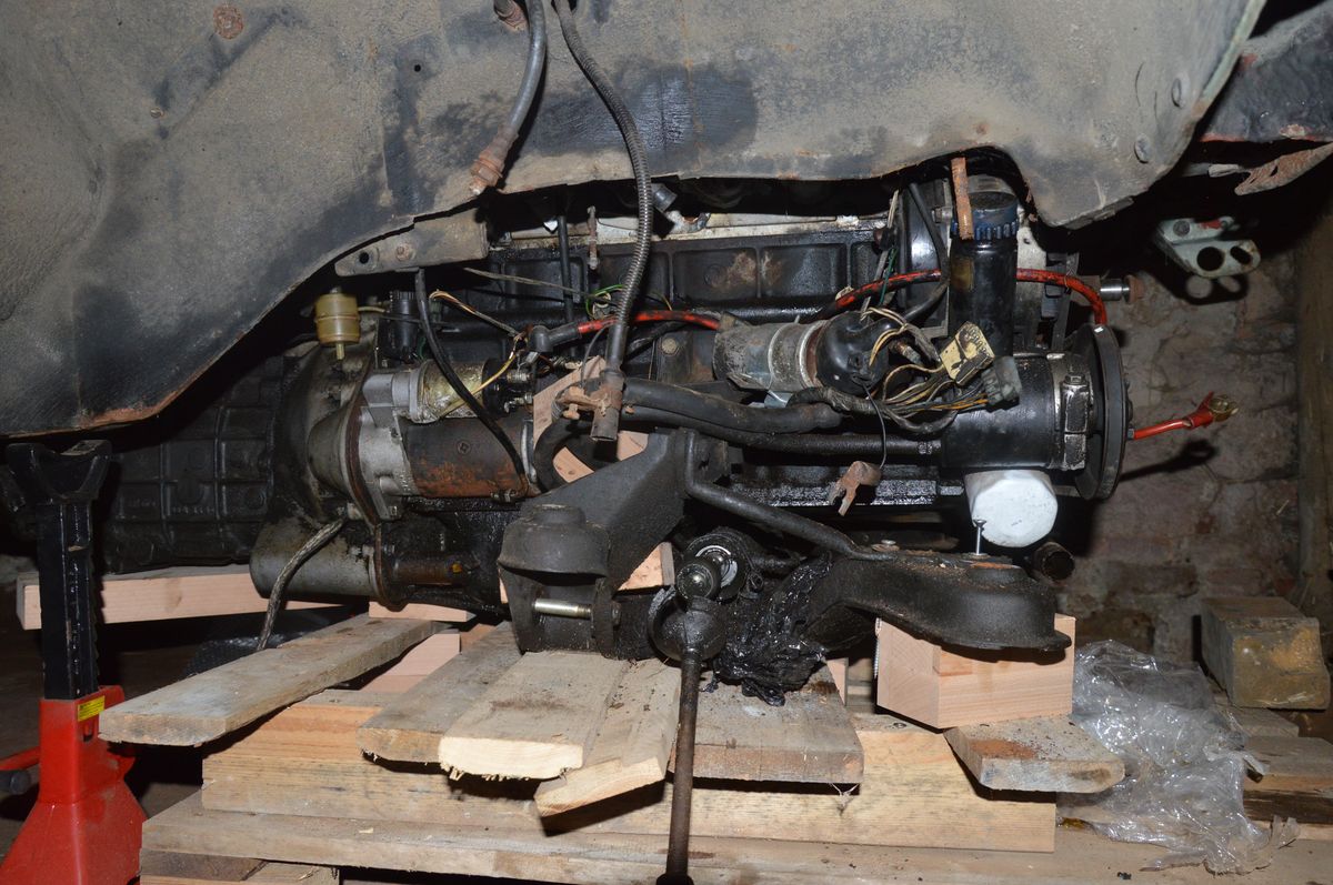 včera jsem si čumák pustil nejníže co mi stojánek povolil, dneska jsem si sešrouboval specoš paletu, pak ju šupl pod auto a na ni přišrouboval motor s nápravnicí a vypodložil převodovku. následně povolil 4 šrouby držící převodovku pod řadící pákou a pak čtyry šrouby držící nápravnici a šup, byl dole :-)