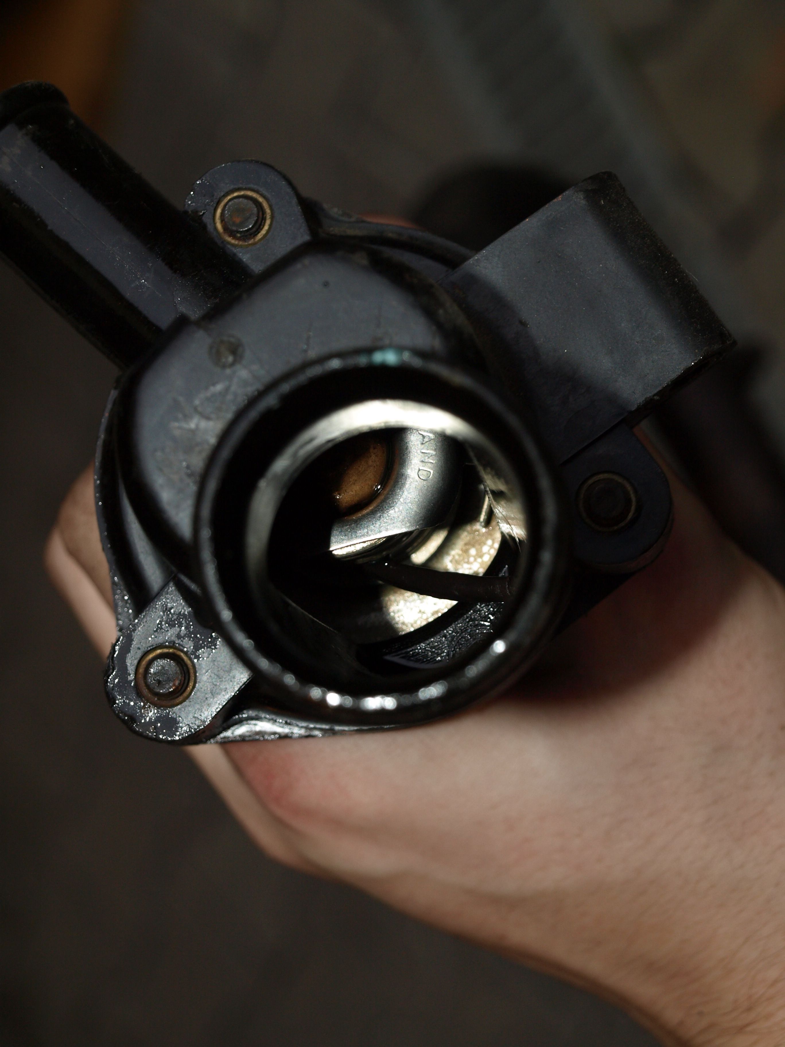 Tak jen pro info... abych vyndal celý domeček termostatu i s trubkou ven, musel se vymontovat filtrbox, cívka, pak na té trubce povolit ty pitomě nejpitoměji umístěný šrouby... nehledě na to, že blboni tam neudělali vypouštěcí ventil na vodu, tak to o přední nápravnici vždycky stříká všude možně, jen ne přímo do kyblíka. V termostatu byl jakýsi dlouhý sopel silikonu... a pak jsem přišel na to z čeho - někdo tím těsnil domeček do bloku. O kroužek tam byl snad původní vyčvachtaný. Dal jsem novější, nakonec se mi tam domeček podařilo napasovat. Celý to smontovat, sprostej sem u toho byl jak dlaždič. K tomu všemu se mi ulomil drátek u jednoho z čidel teploty, tak jsem musel ufiknout ze záložního svazku konektor i s drátkem a napojit to. Na tu ocelovou trubku se mi podařilo umístit jen jeden ten šroub, bohužel tedy ten pitoměji umístěný. Zjistil jsem, že ne odvzdušňovcí spojce z motoru byla dírka, kterou to foukalo ven. Bohužel až když jsem to celé smontoval a nastartoval, tak jsem si všimnul, že to teče ještě z hadice z topení dirkou kousek před termostatem. Trošilinku si to tam probublávalo, tak to budu muset ještě jednou vypustit a tu trubku tam fiknout a nějak napojit. No starý hadice jsou peklo...