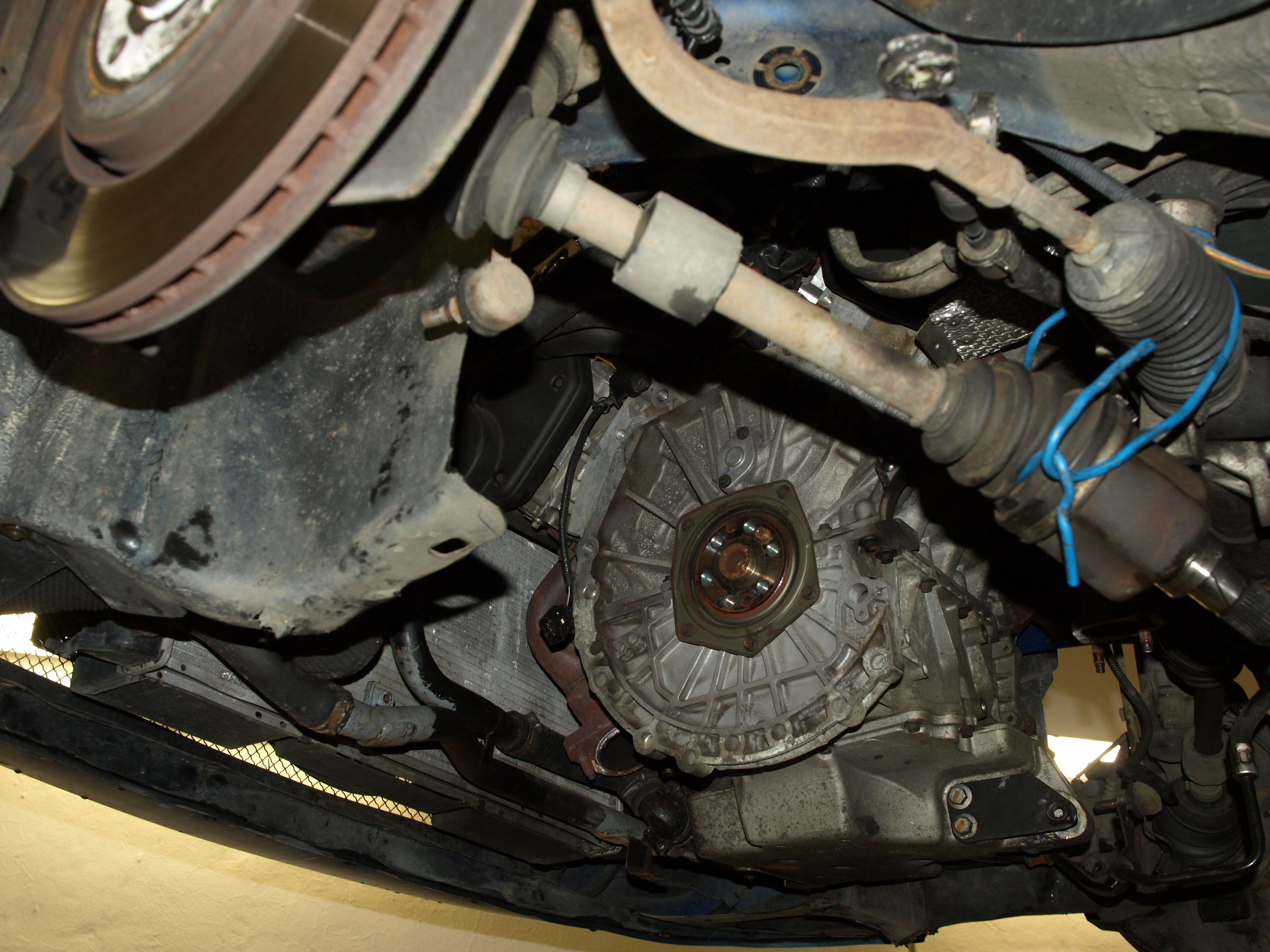 Udělali jsme si s Mirdou "mejdlo" a minulý týden jsme se do toho jedno krásné odpoledne pustili. Zlatá Labuťka s Kupéčkem! Tohle bych doma páchat nechtěl... kvůli pitomému sundání převodovky se musela rozbombardovat půlka auta - přední podvozkový rám dolů, vypustit olej a poloosy z převodovky ven, odpojit všechny lambdy a komplet celý výfuk pryč včetně tepelných štítů u motoru. V motoru box pryč, držák baterky, to a ono....