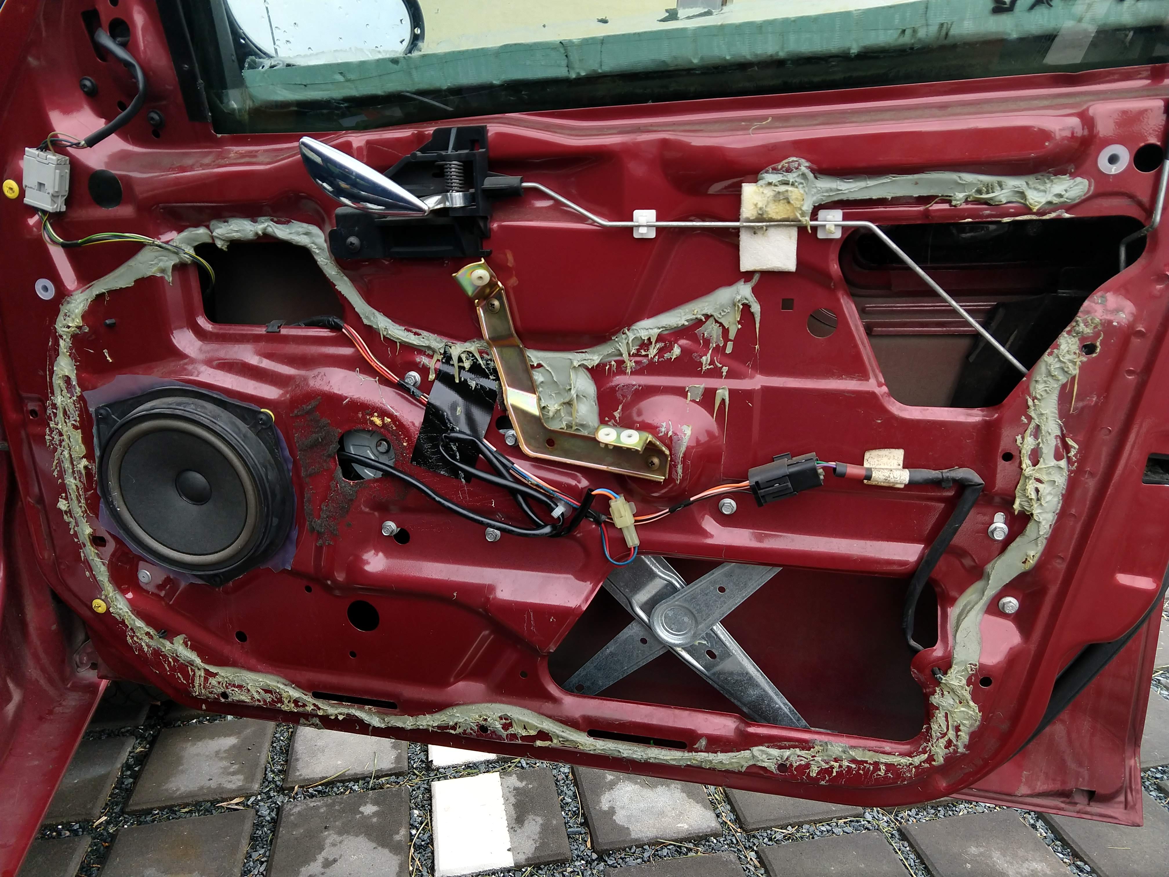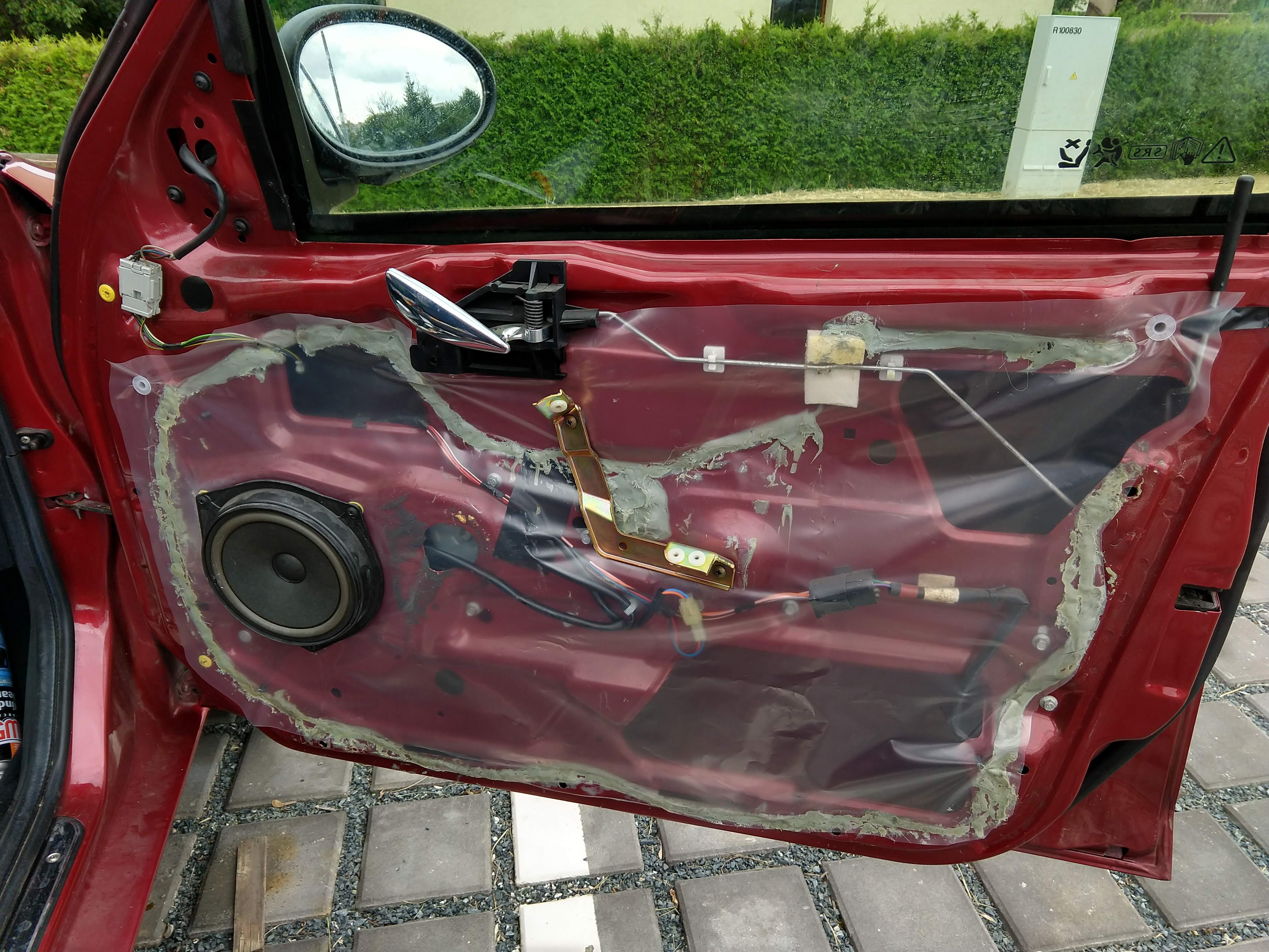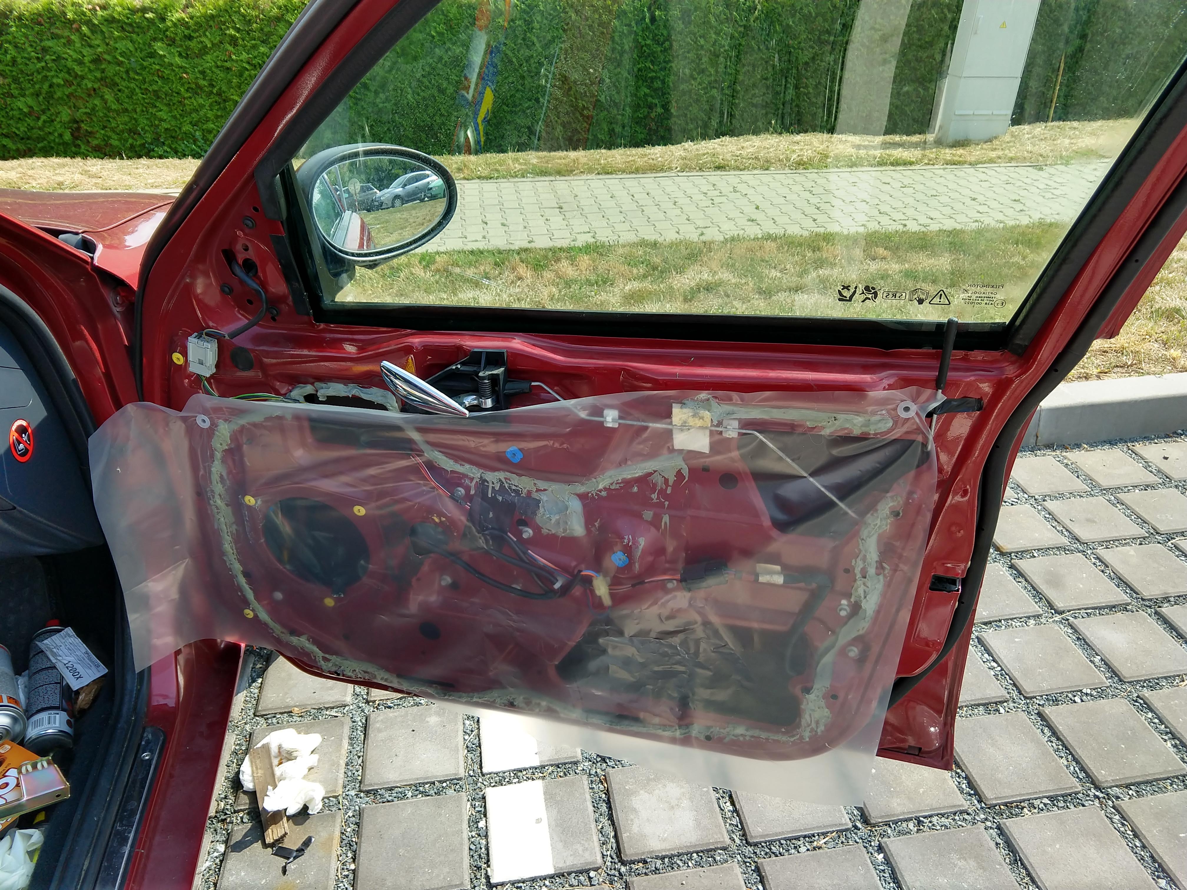 Dal sem zjistil proc dvere zni tak plechove a lacine a drncive ... vevnitr dveri je vyzstuha a plech dveri je na ni nalepenej tmelem aby se to tlumilo... ten tmel se opd plechu dveri po letech odtrhl a tim se ten plech mohl vlnit a drncet... takze sem to zatmelil sikaflexem. Neni to moz hezky, ale naprd pristup a ... kruciprdel na parkovisti