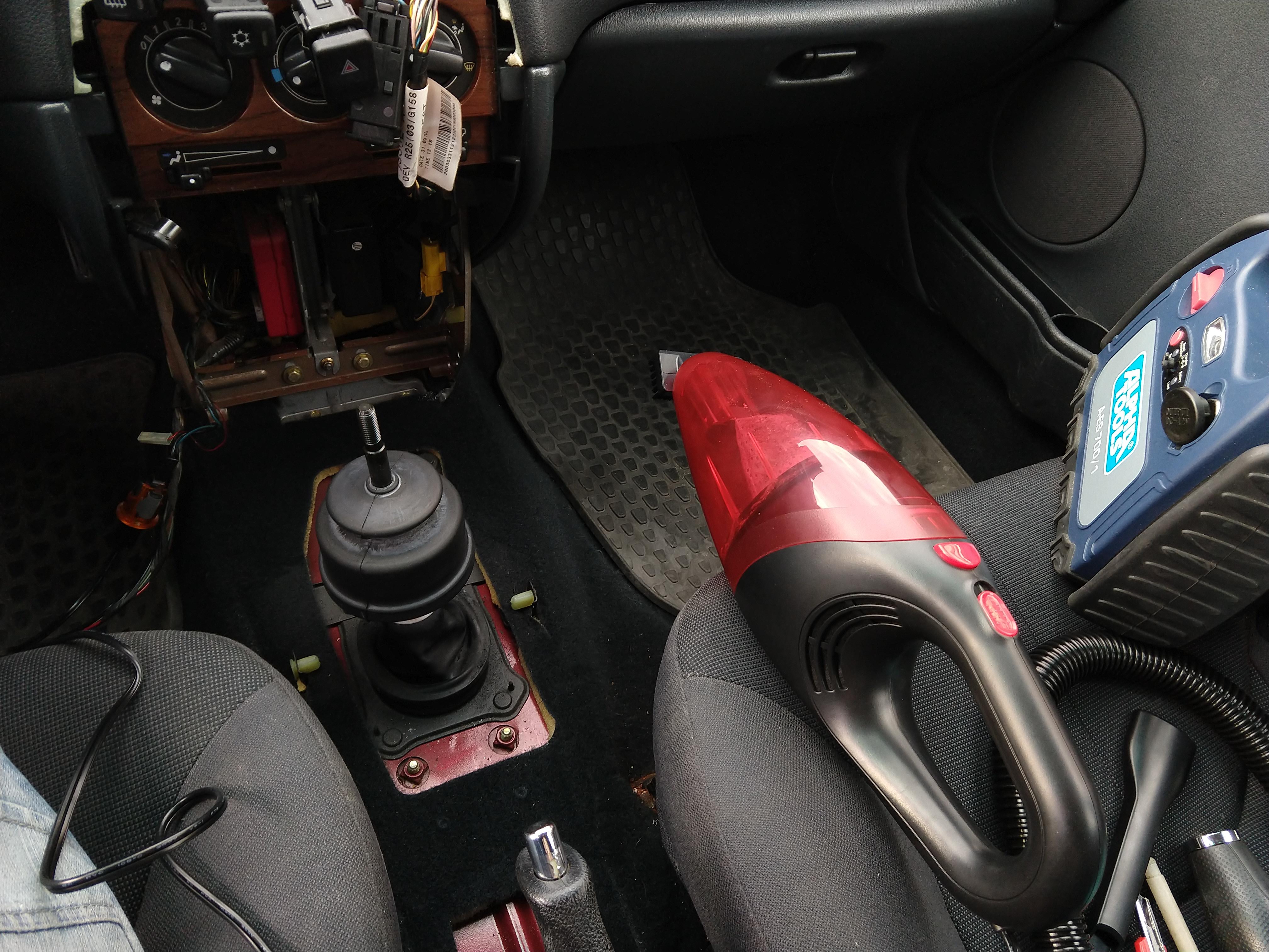 Takze sem vysal koberec pod stredovou konzoli, ten levnje vysavac z lidlu funguje prekvapive dobre (saje to samozrejme vcelku mizerne, ale ma to kartacek, takze clovek to kartacuje a na to posbirani toho vycesanyho bordelu to staci, vratil tam vycistenou konzoli.