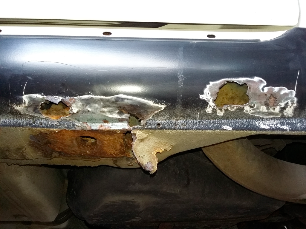 Nejdříve hrůza zadních prahů. Vypadaly sice trošku rezivě, ale nic kritického. Dokud jsme nevzal šroubovák.