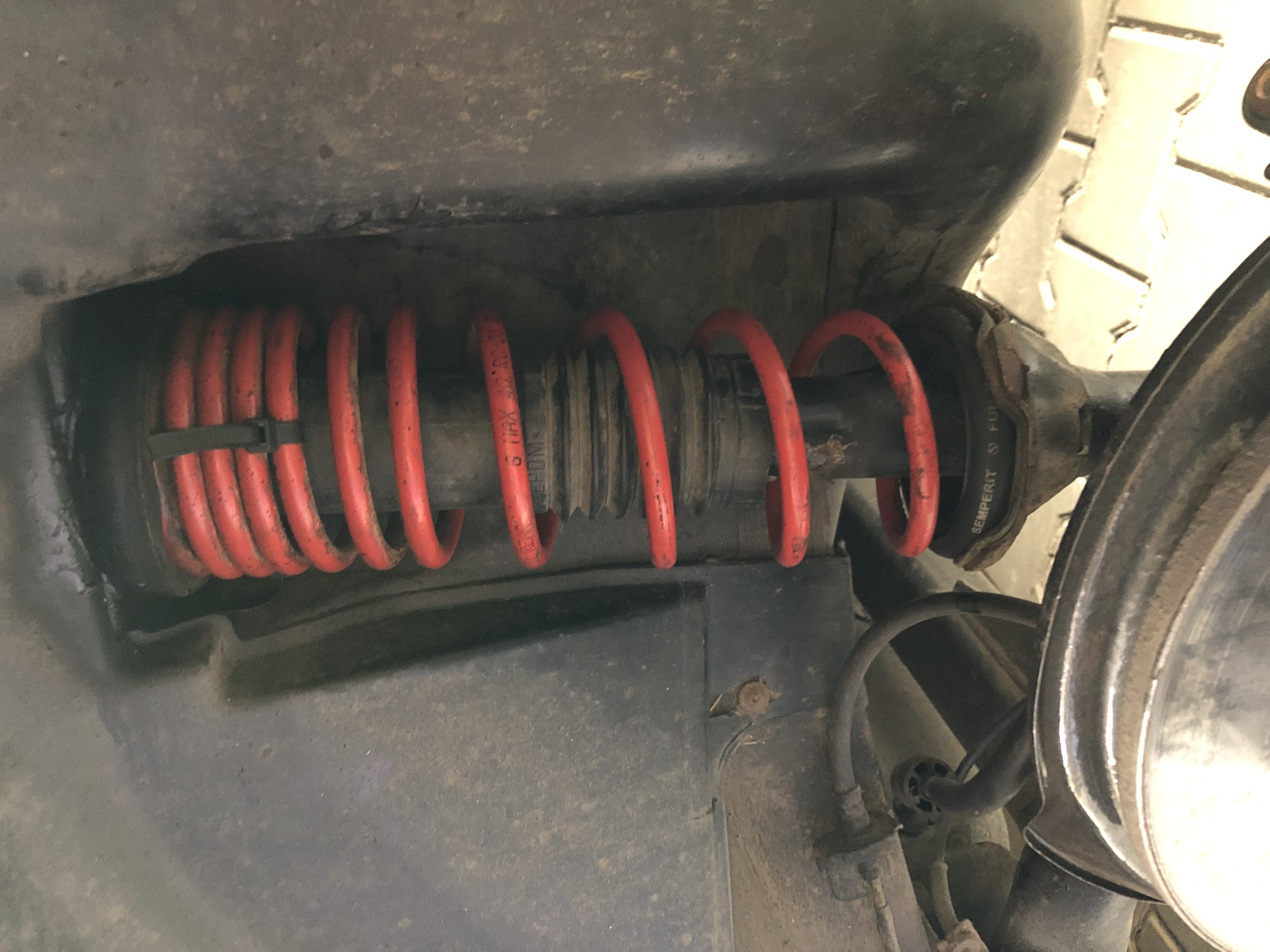 A mimochodem, po nějakém dalším týdnu ježdění bylo vidět, že pružina klepala o bok podběhu. Zřejmě se při propružení v mistě nějak propadla a vybočila se do vnitřní strany.