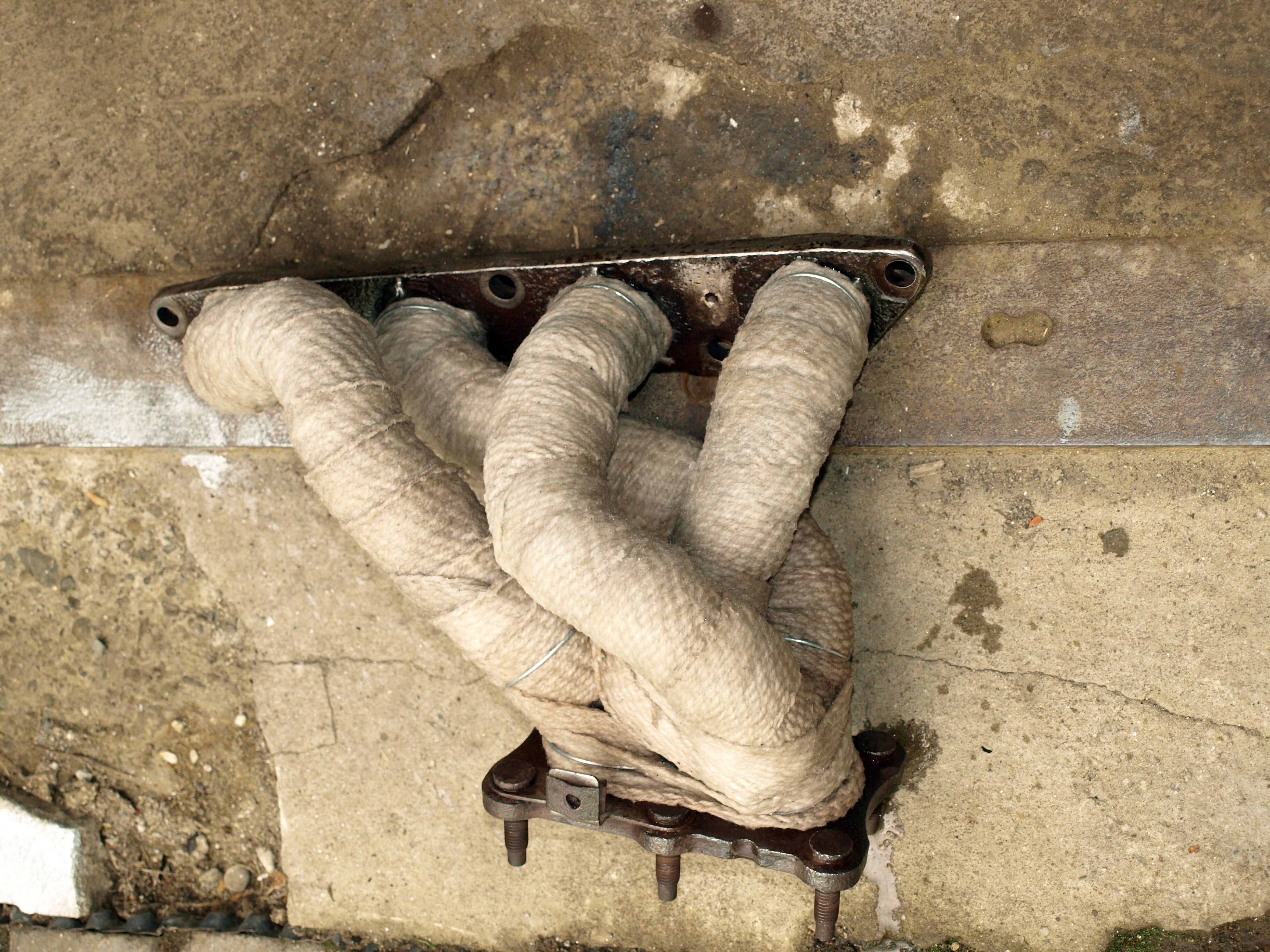 Omotal jsem svody a část prvního dílu od svodů. Po té jsem to řádně nacucal vodním sklem no šlo se na montáž. Byl celkem mor sám pod autem na špalkách se mordovat s těma těžkýma trubkama, ale podařilo se. Smontováno bylo a tak jsem si dopřál prvního nastartování a čoudu z omotávky