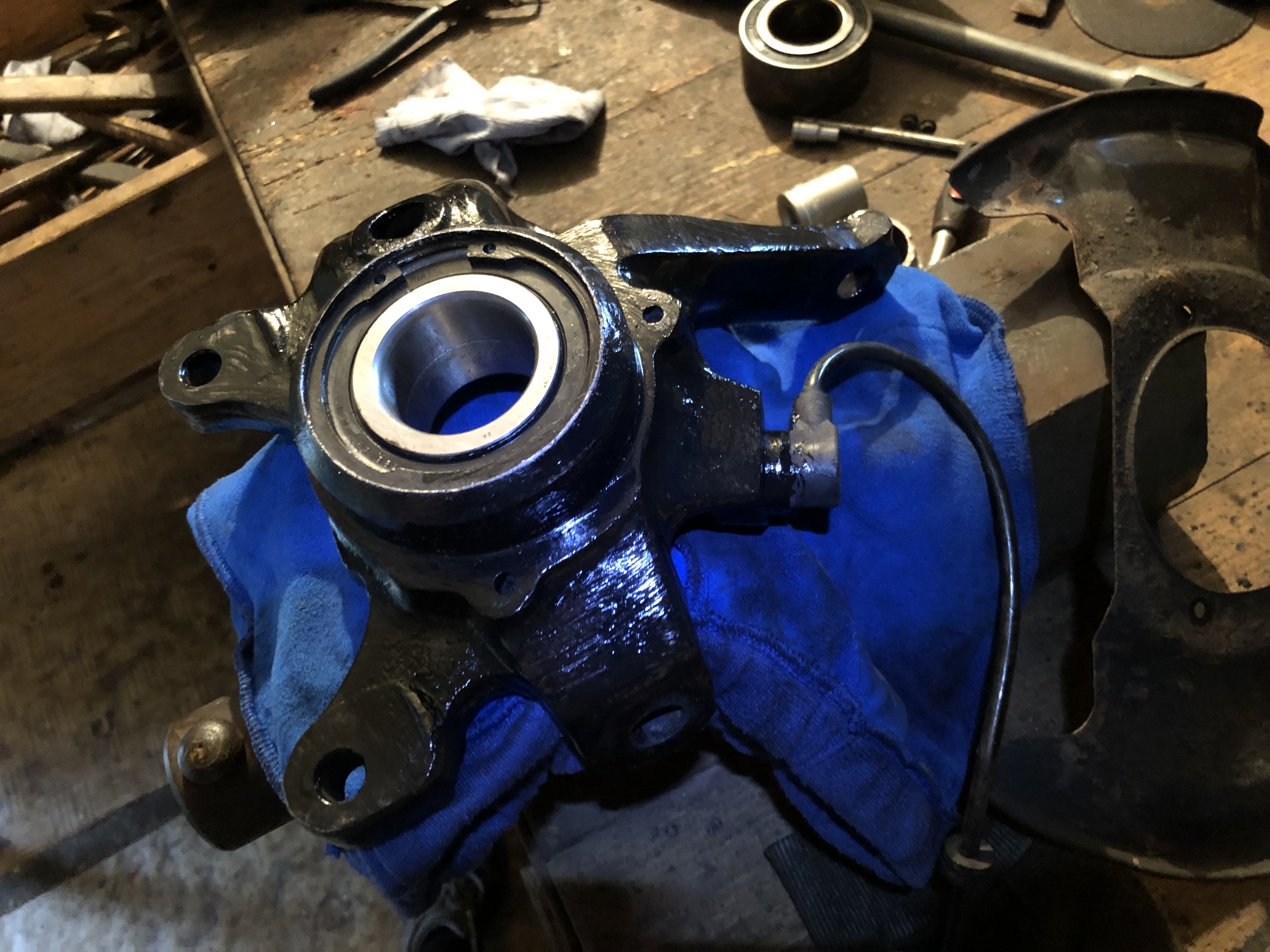 Zprvu jsem si myslel, že těhlici rozeberu opět pomocí palice a svěráku a pak na zalisování použiji lis, kterému schází pouze dodat pružiny. Takže jsem to rozpadl, jen kroužek z unašeče kotouče jsem musel nařezávat flexou dvakrát, než povolil. Jo a segerovka tam byla zahnilá jak sviň a tu jsem z tama doloval snad půl hodiny. No a jak jsem to měl rozebrané a viděl tu ohnilou potvoru těhlici, že bych do ní měl dávat nové ložisko, tak mi to nedalo a celou těhlici jsem tak nějak ojel flexou a pilníkem, natřel nejprve odrezovačem a pak zbytkem Hammeritu. Tak nějak halabala, aby to nebyla koule rzi a aby to ohnilo až za rok