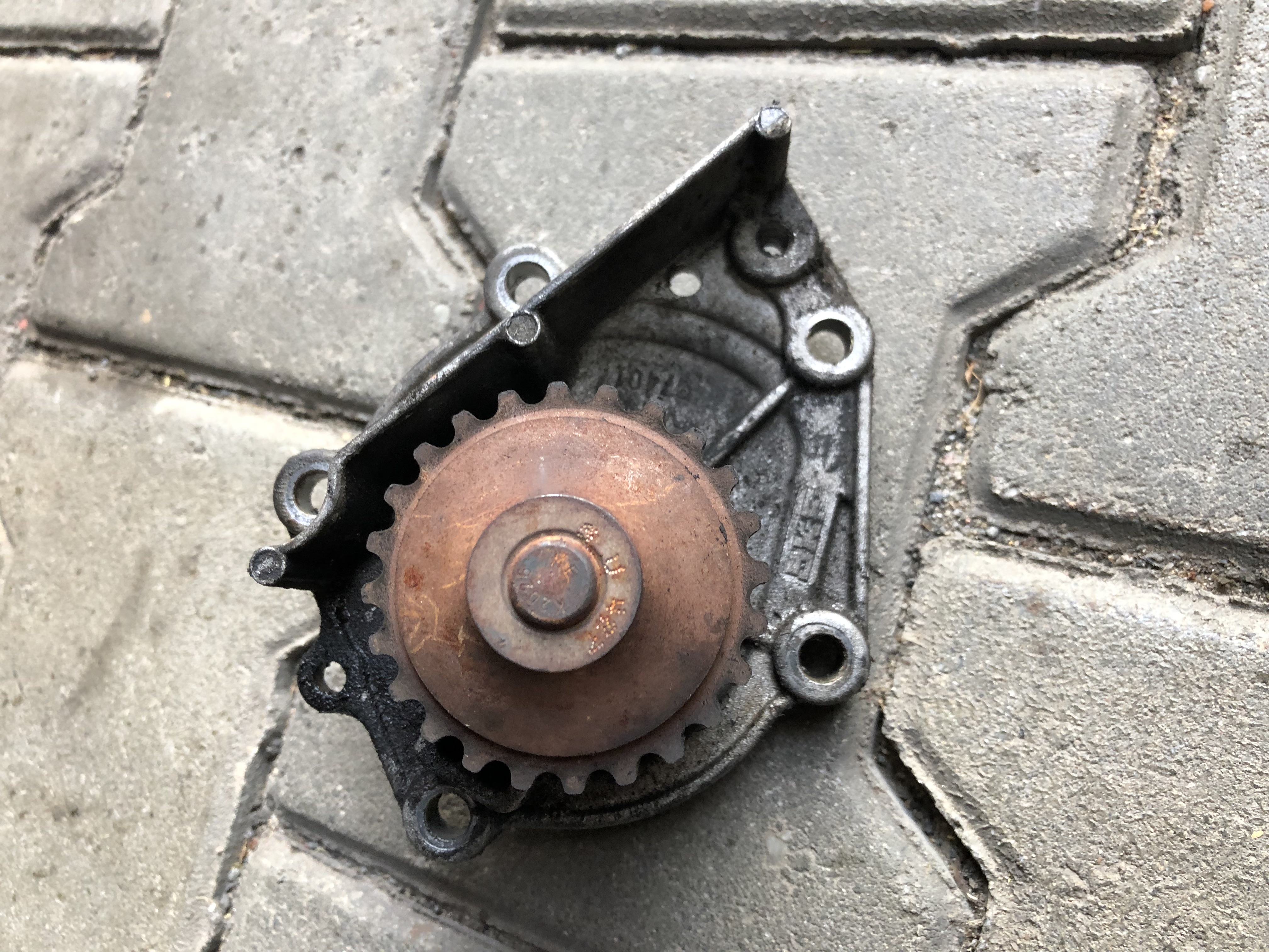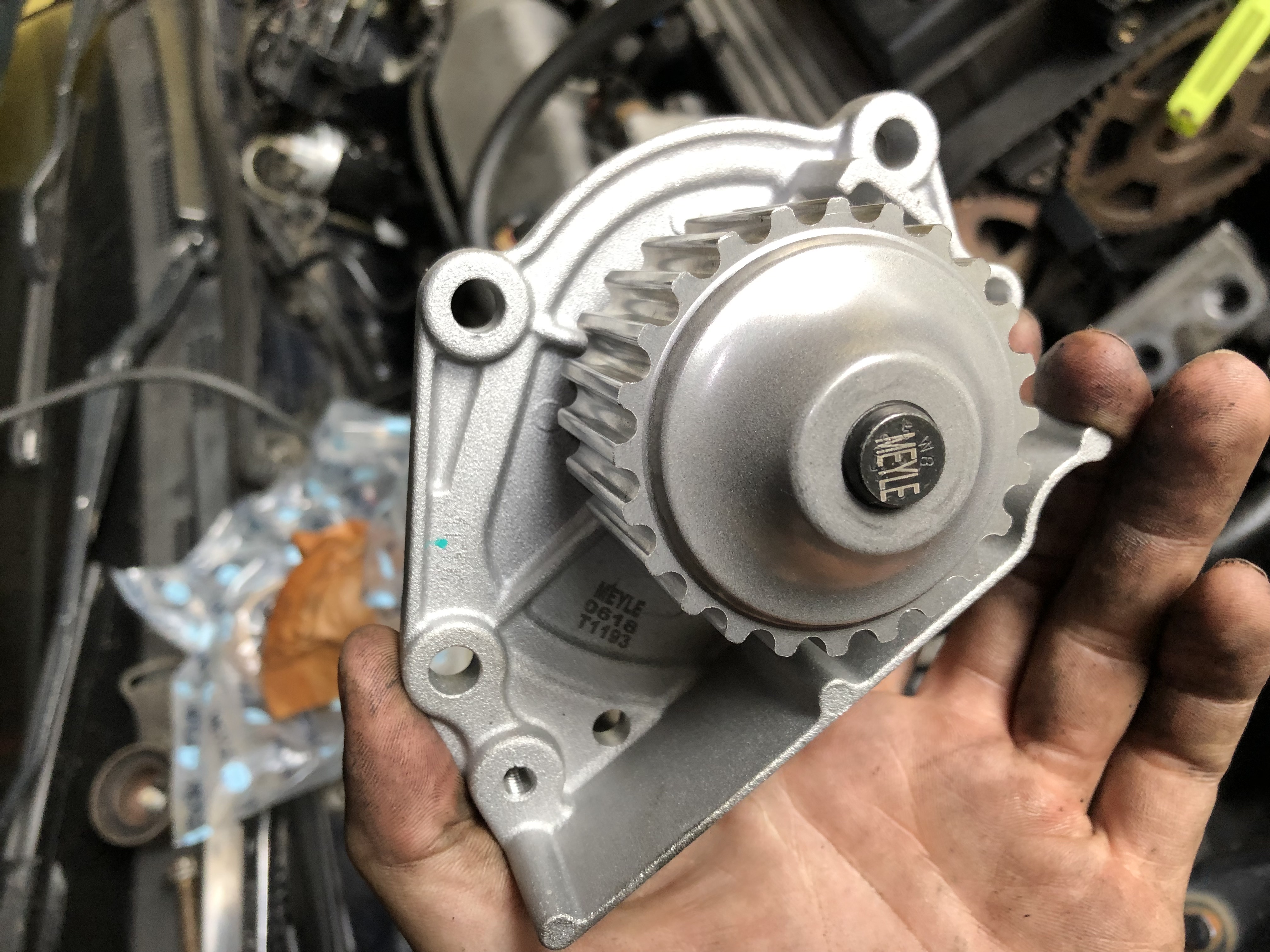 Původní pumpa byla SKF. Ale při protočení je taková zadrhnutá a uvrzaná. Gumové těsnění v ní bylo dost slehlé, tak jestli to neproteklo třeba i přes něj... nevím. Nová Meyle pumpa měla sice v krabici dvoje nové těsnění, ale tedy musím říct, že ta celkem tenká gumička ve mě moc důvěry nevzbuzuje.