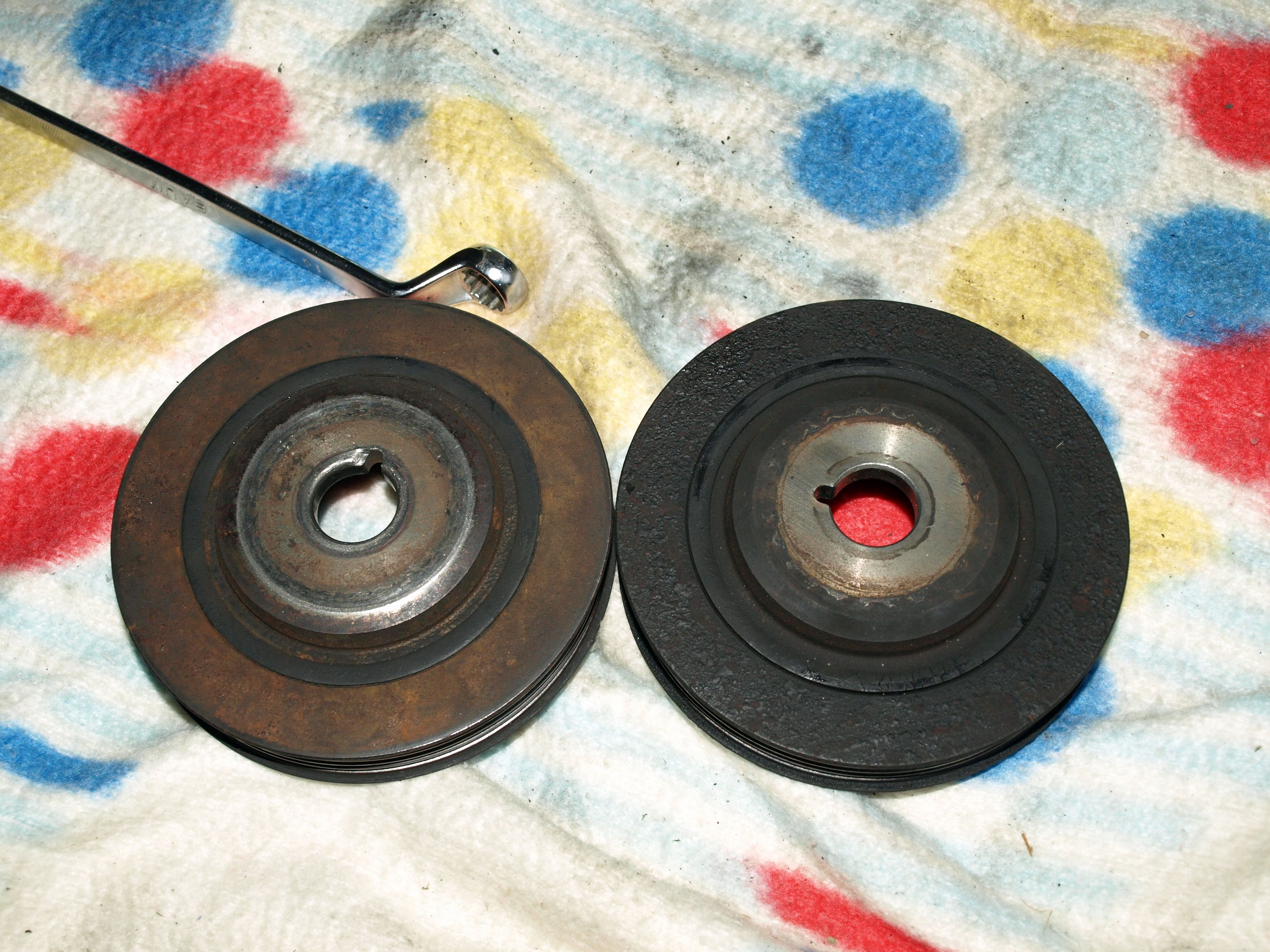 Chtěl jsem najít jak vypadá rozvodové kolečko uvnitř, když jsem ho fotil vyžvejkaný, ale nenašel jsem. Tak aspoň fotka rozdílu ožužlaných řemenic.