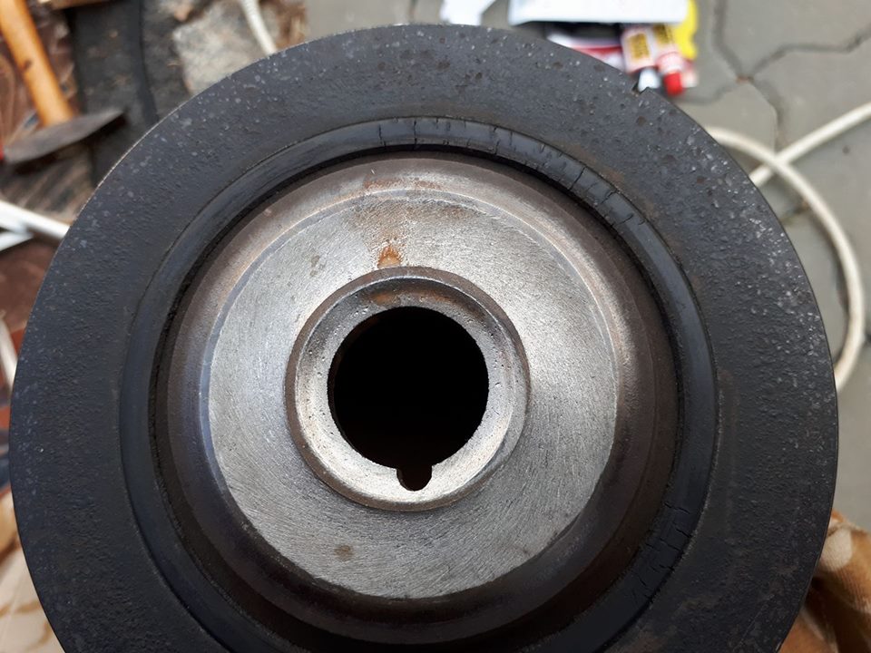 Na Kupéčku se mi to povolilo i tehdy, když jsme dali nové kolečko, na tmel, šroub na lepidlo a zánovní řemenici. Zase se to po půl roce povolilo. Už jsem motor odepsal, protože klika byla fakt škaredě ožužlaná a tak jsem se rozhodl pro poslední prasácký pokus. Dal jsem zase kolečko s vrtaným klínkem, dal jsem zánovní šroub, celé jsem to opravdu festovně dal (i styčné plochy řemenic) na silové lepidlo a svařil jsem si ze starých topenářských trubek pořádný trhák, kterým jsem to proti zaaretované řemenici dorval co to šlo. A kupodivu tohle prasácké řešení (bez podtmelení kolečka a řádného dopasování) drží ze všech nejlépe