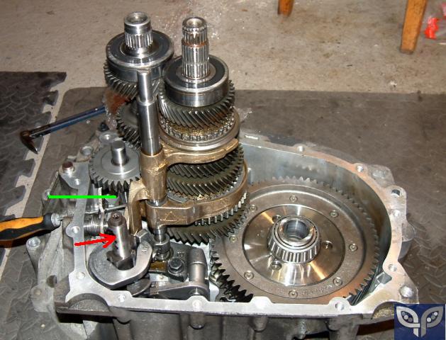 Na obrázku je červenou šipkou vyznačeno, kde je ten spodní šroub a zřejmě tam zajišťuje aretační kuličku s pružinou pro tyčku s řadicími vidlicemi, zeleně je označena hladina oleje a místo kde je zhruba ten horní kontrolní šroub.
