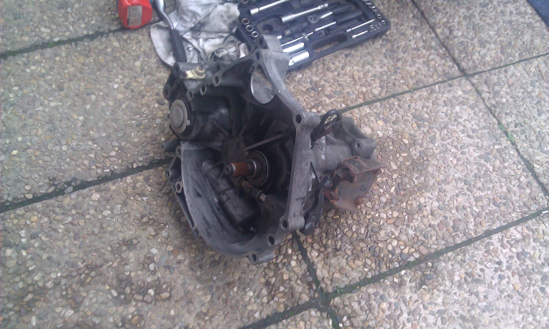 Tak nakonec musela prvně ven spojka, protože už měla fakt nejlepší léta za sebou, při tý příležitosti jsem na zkoušku dal skříň z dárce motoru, abych zjistil v jakým je stavu a jak se jezdí se ZS se skoro-správným diferákem. Zjistil jsem, že sice řadí dobře, ale jako všechny pg1ky jsou taky vháji ložiska a původní z turbáka je pořád ještě vejpůl a nemám zatím všechny ložiska na složení.