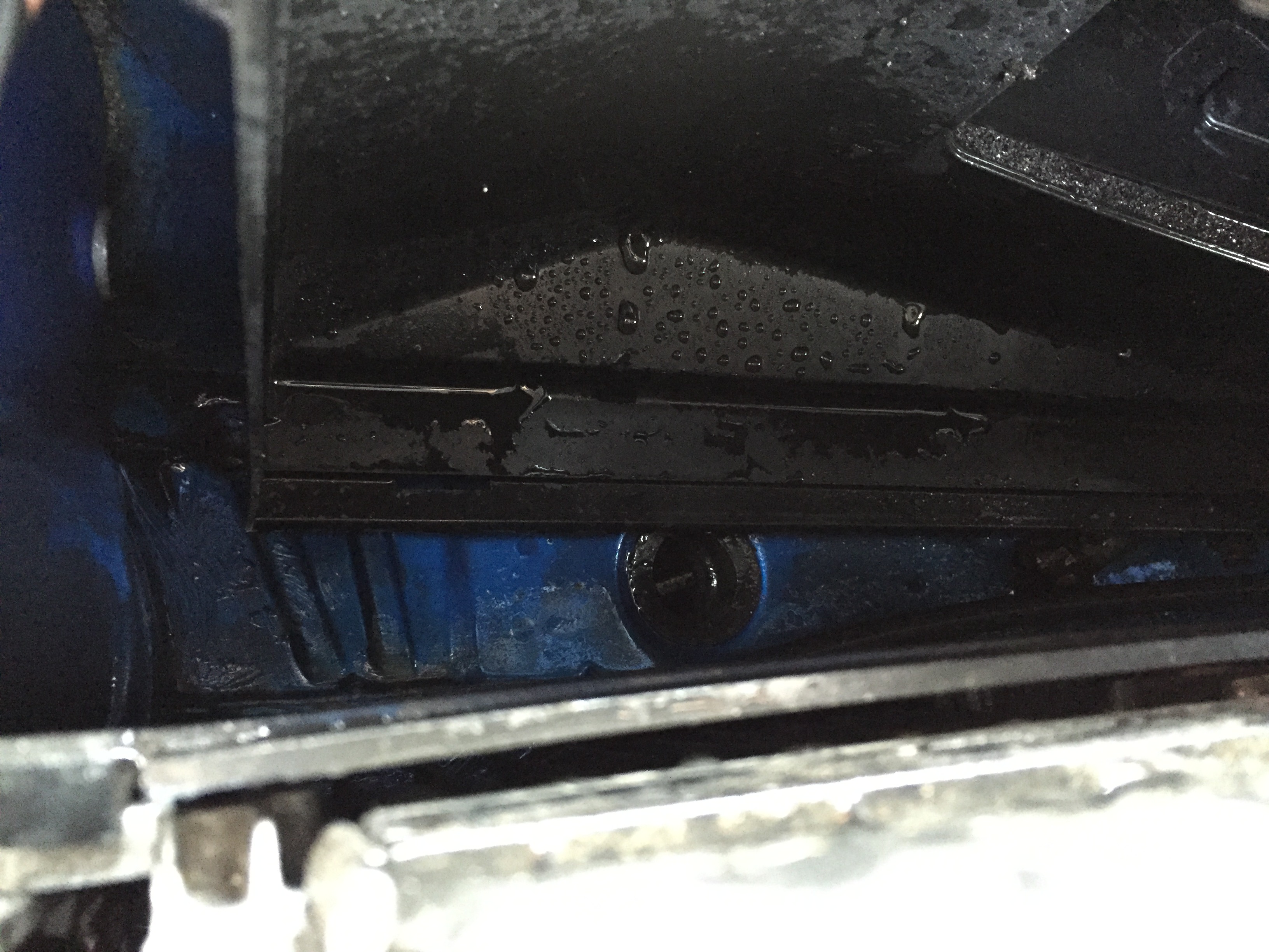 Když už jsem řešil tyhle odtoky, tak jsem zkouknul přední z přepážky mezi motorem a kabinou. Stěrače a dekly pryč, moc bordelu tam nebylo, čekal jsem víc. Před spolujezdcem bylo nějaký listí, ale odtok ucpanej nebyl. Zato u řidiče to neodtejkalo, ale protože pod posilovačem není nic vidět, tak jsem se to snažil pošťouchnout spodem. Zespoda už to někdo řešil, obě odtokový hadice už měly odřízlý zúžení. Zespoda drát, zezhora hadice s vodou a šlo to. Nejvíc od řidiče toho šlo odtokem u spolujezdce, kam jsem to vyhnal proudem vody. Pak se uvolnilo i to pod posilovačem.