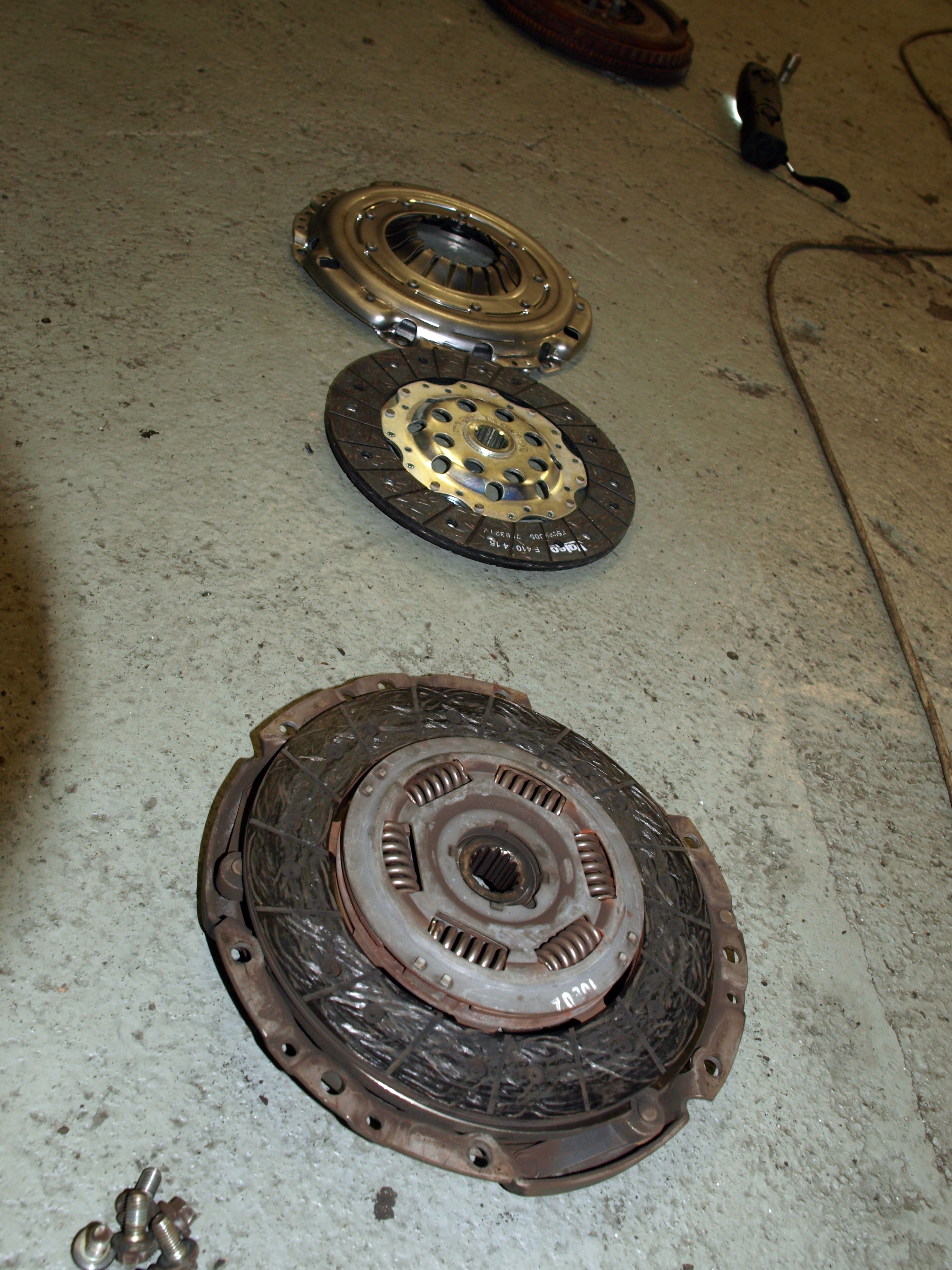 Převodovka dole - jak gufero na klice, tak na vstupu převodovky, oboje suché. Ani na ložisku nebyla žádná vlhkost. V talíři spojky byly hodně volné pružinky, takže nad výměnou spojky nebylo třeba spekulovat. Tohle mi mohlo způsobovat občasné chrastivé zvuky při studeném motoru. No a dvouhmota... jako nic viditelně a citelně zlého na ní nebylo. Proti náhradní (jeté) dvouhmotě tam byl mírně větší rozptyl v pootočení středu, ale po vychladnutí ten rozdíl byl minimální. Každopádně dvouhmota se prohodila, nová spojková sada (talíř už bez pružinek - hurá, konečně přišli na to, že to bylo zbytečné kurvítko