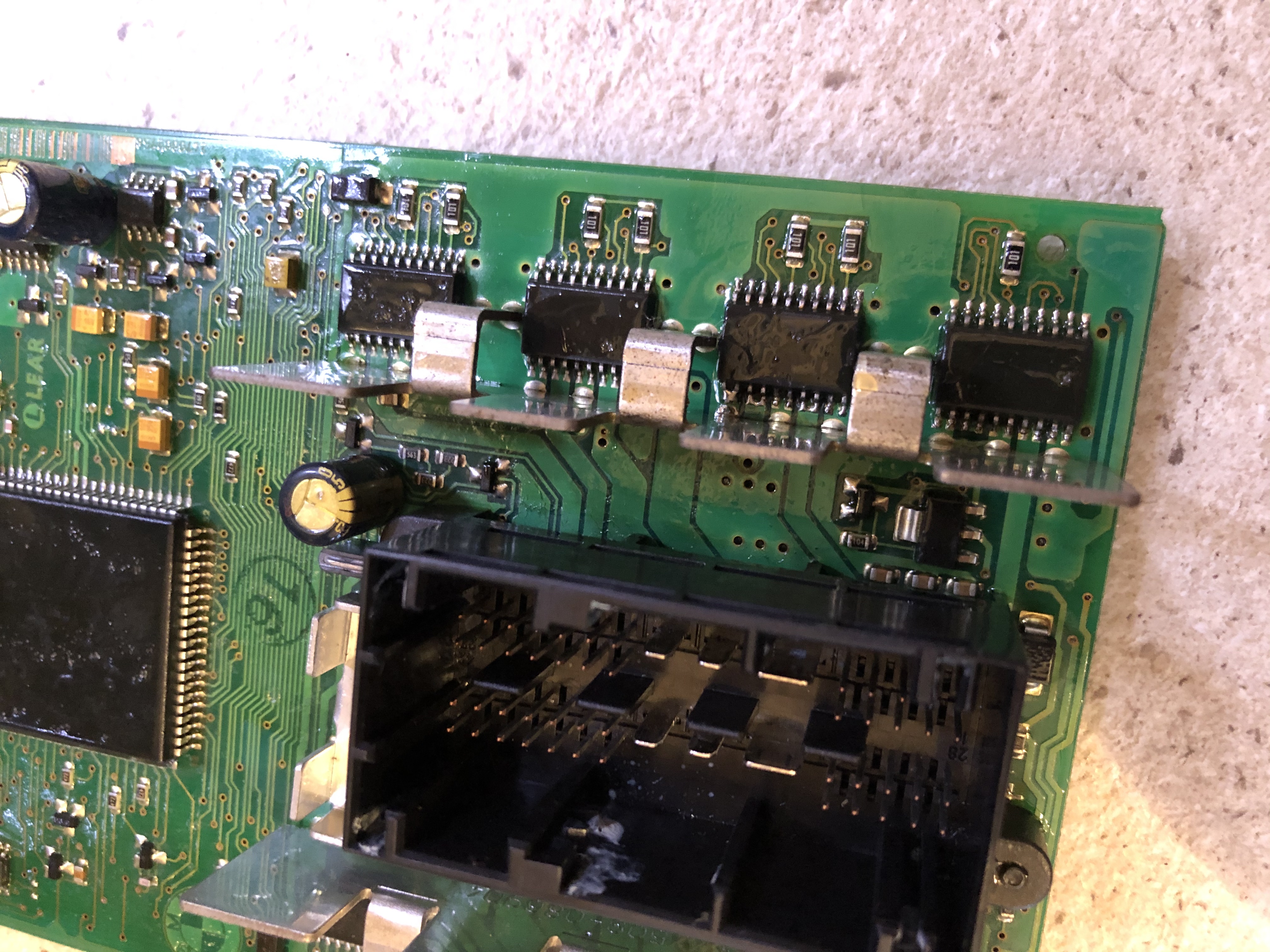 Tedy jednotku jsem vyčistil, propájel, zalakoval a na to vyboulení nad ní jsem nalepil kus tuhé fólie tak, aby to udělalo stříšku a případně to kapalo až za jednotku na plastový kryt nad pedály.
