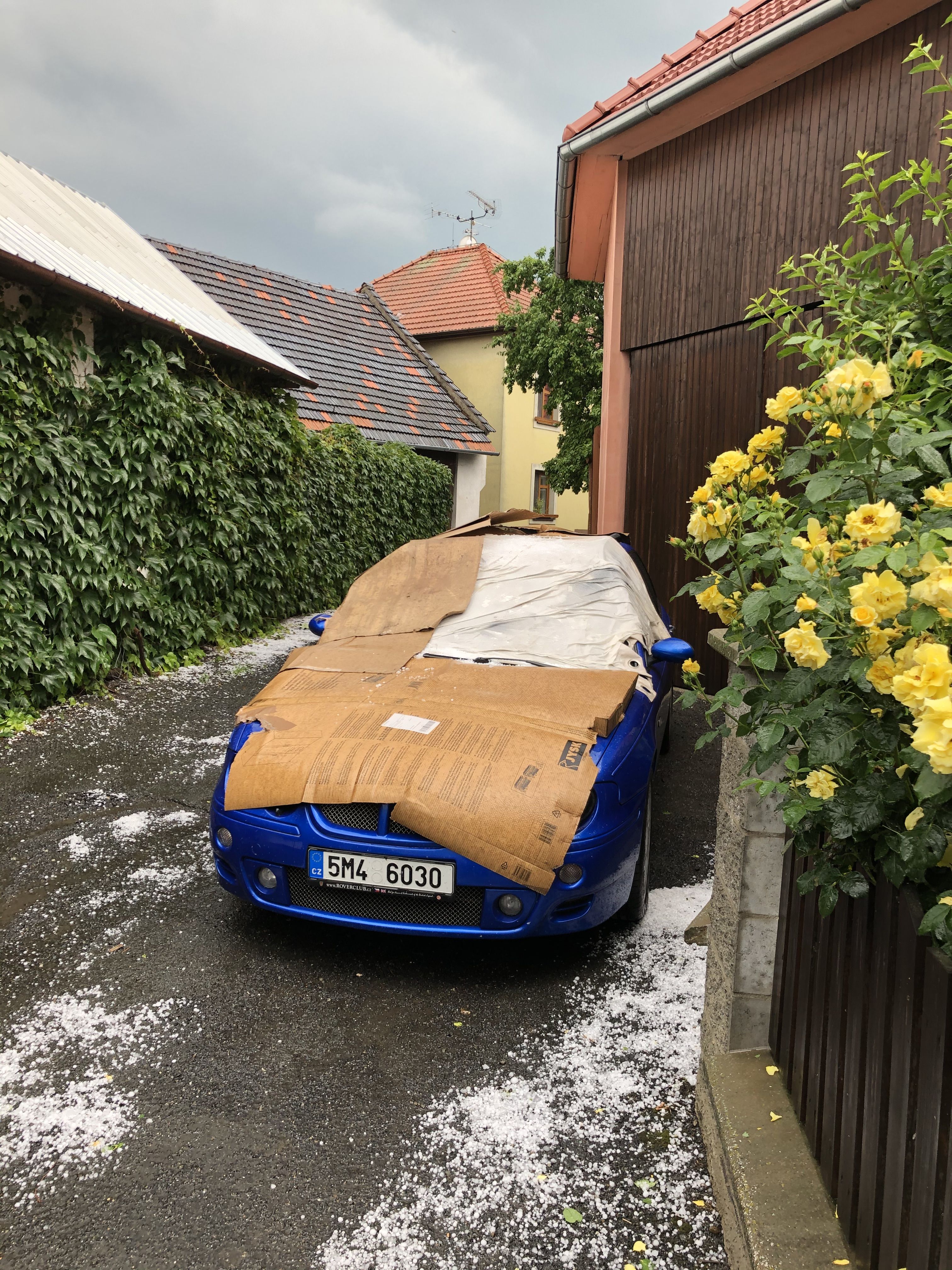 Jo tohle uz jsou docela velky kroupy. Z mych spise pocitovych vedomosti, je tohle tak ta velikost, kde se to lame mezi tim, ze to (stranou uplne papiraku) nic jeste neudela a ze uz to muze neco i zpusobit. Byt o neco mensi, tak bych se ani moc nebal bez prikryti, Byt ale o neco malo mensi, tak uz se bojim fest.
