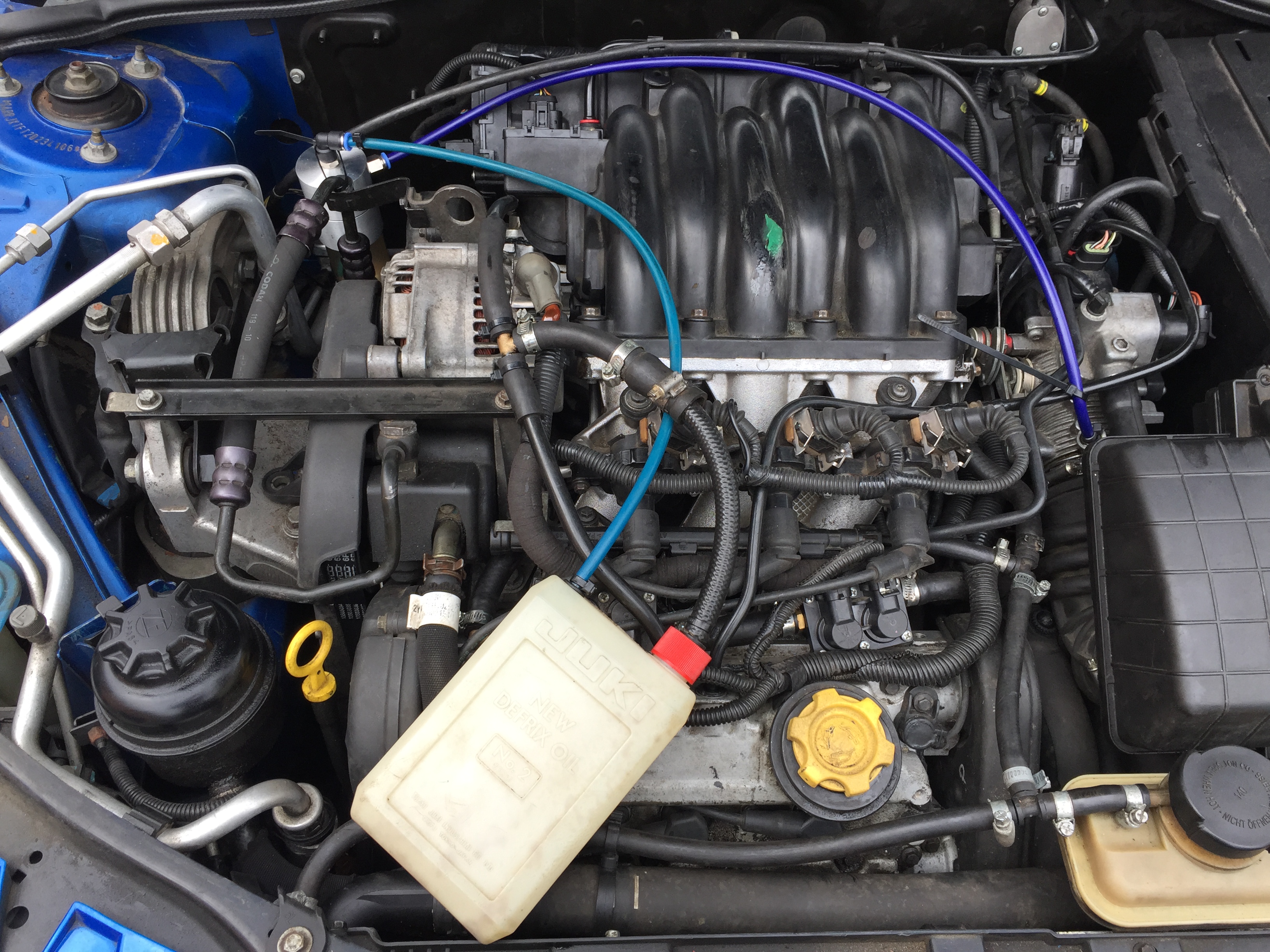 Nějak nechápu, kudy se tam ten olej ještě dostává. Ten lapač na větvi za klapkou jsem zrušil a zapojil obě nádoby do série za sebe, prvně velkou, pak tu malou a uvidím co kde bude...