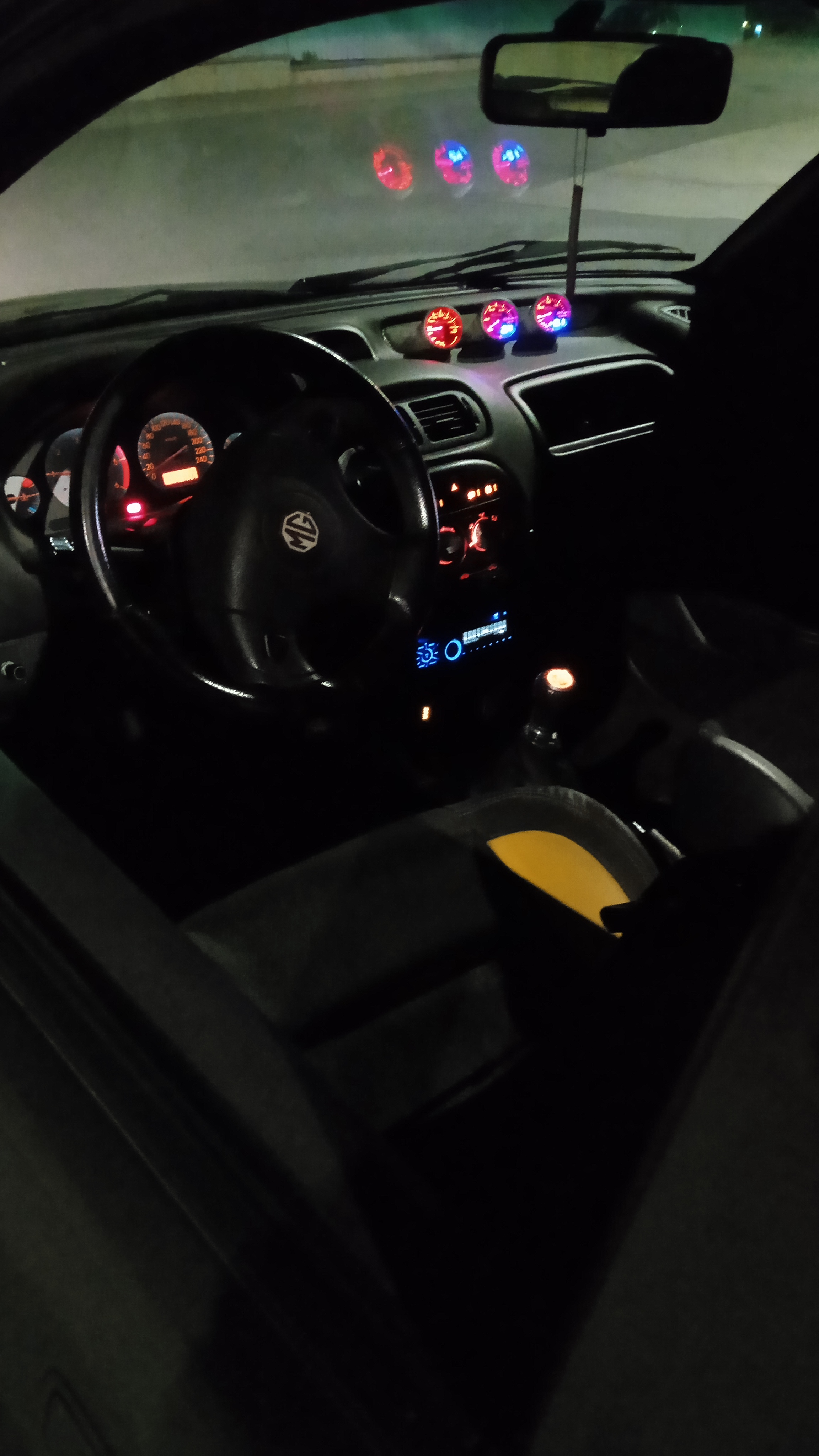 Přídavné budíky tlak+teplota oleje a tlak turba (nakoupená nová čidla), volant z MG F, loketka z Coupe, žluté sedačky ze ZR s nájezdem 100 tisíc v pěkném stavu, stropnice a stínítka přečalouněná na černou, interiérové plasty též komplet černé.