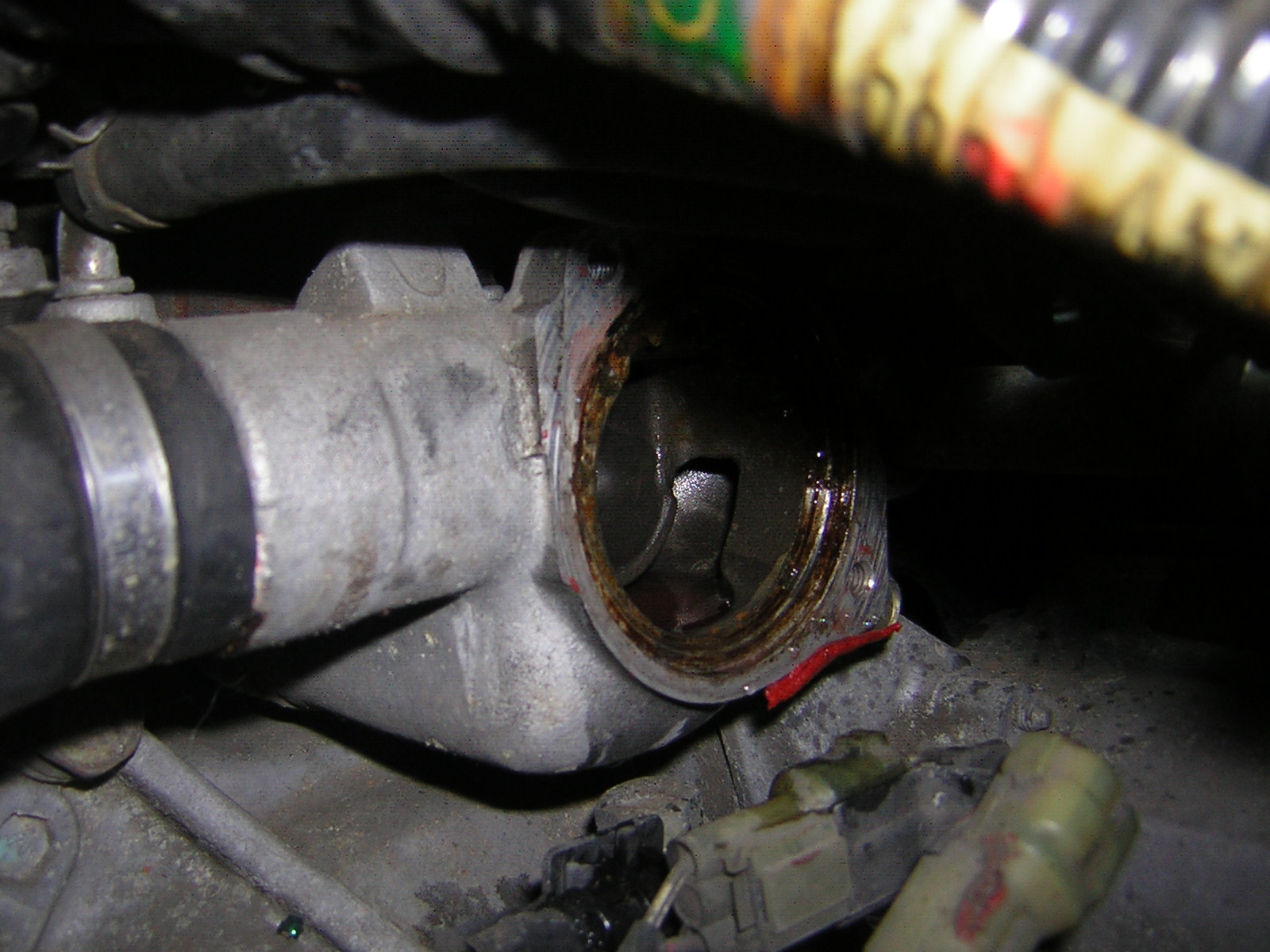 Pak jsem si musel udělat místo, abych se dostal k domečku termostatu, takže baterka, celý airbox včetně hadic museli jít ven. Už při rozdělávání domečku jsem si všimnul červeného silikonu místo těsnění mezi přírubami a po rozdělání jsem hledal termostat - marně. Zrejmě někdo usoudil, že se bez něj obejde a tak ho vyndal