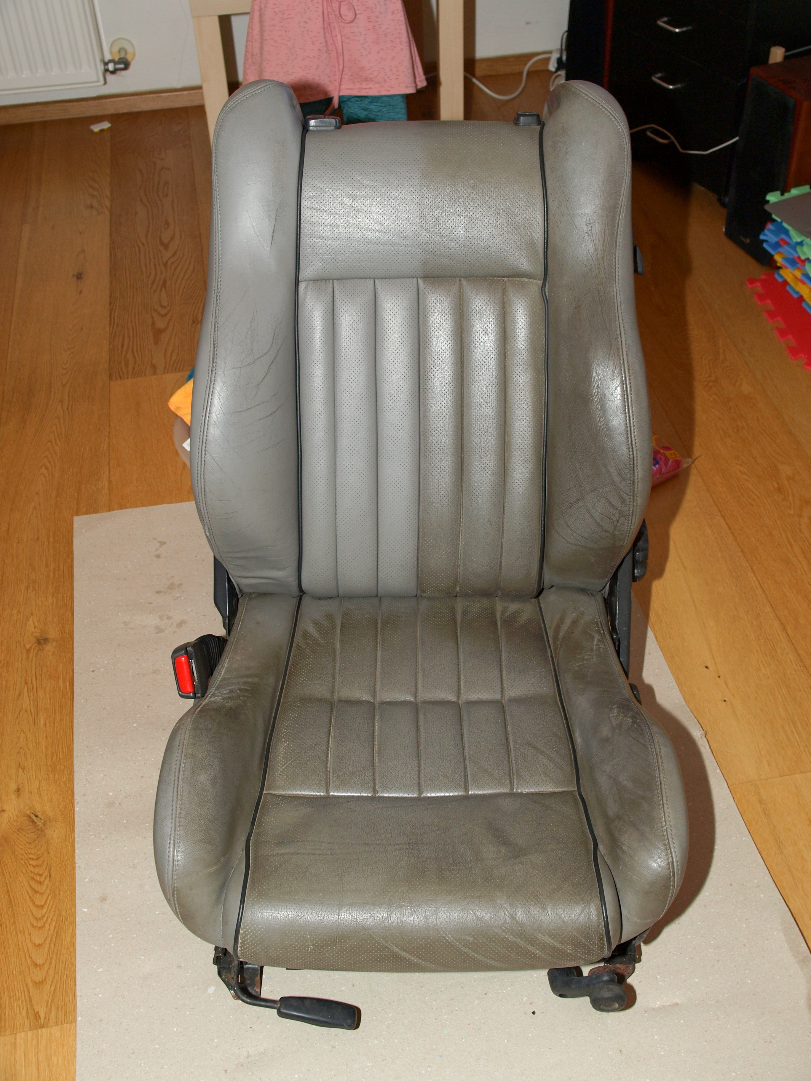 Stav sedaček... no... z kabria a původní majitelé asi totálně dlabali na to, že by se o kožené sedačky mělo nějak pečovat. Takže totální hnůj viz. foto. Nicméně pod tím humusem jsem neviděl nijak moc zásadních vad. Spolujezdcova sedačka má natrhlý kožený bok sedáku. Zadní sedák je propálený. Šoférova sedačka má kvůli nulové péči ošoupanou barvu. A jsou orezlé úchyty do podlahy. Klasika...